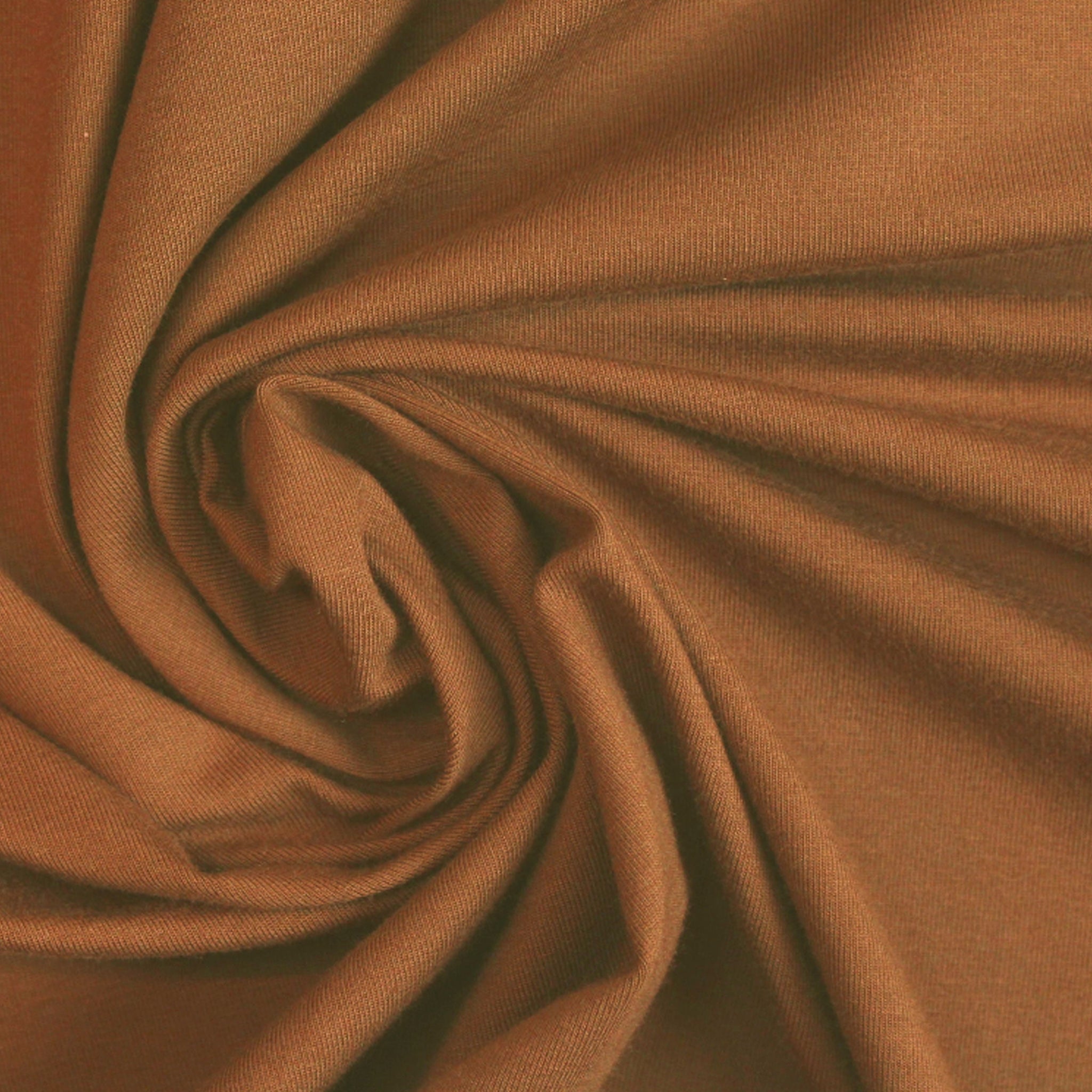 Here is the same quality cotton knit as our wonderful Dutch cotton knit prints in a solid color, imported from The Netherlands! The quality of the fabric is sublime, soft and substantial, with about 30% stretch in both directions. It is opaque and has a luscious hand and drape with body. The color of this one is a pretty cocoa brown (PANTONE 18-1321 is close). Make a fabulous tee, top, tunic, skirt, dress, tights, etc. The manufacturer recommends hand or machine wash warm, hang to dry. Please test first. Oeko-Tex certified for non-toxic chemicals and dyes.