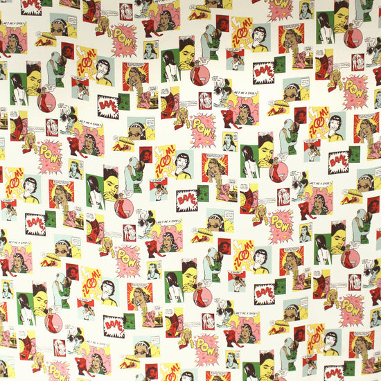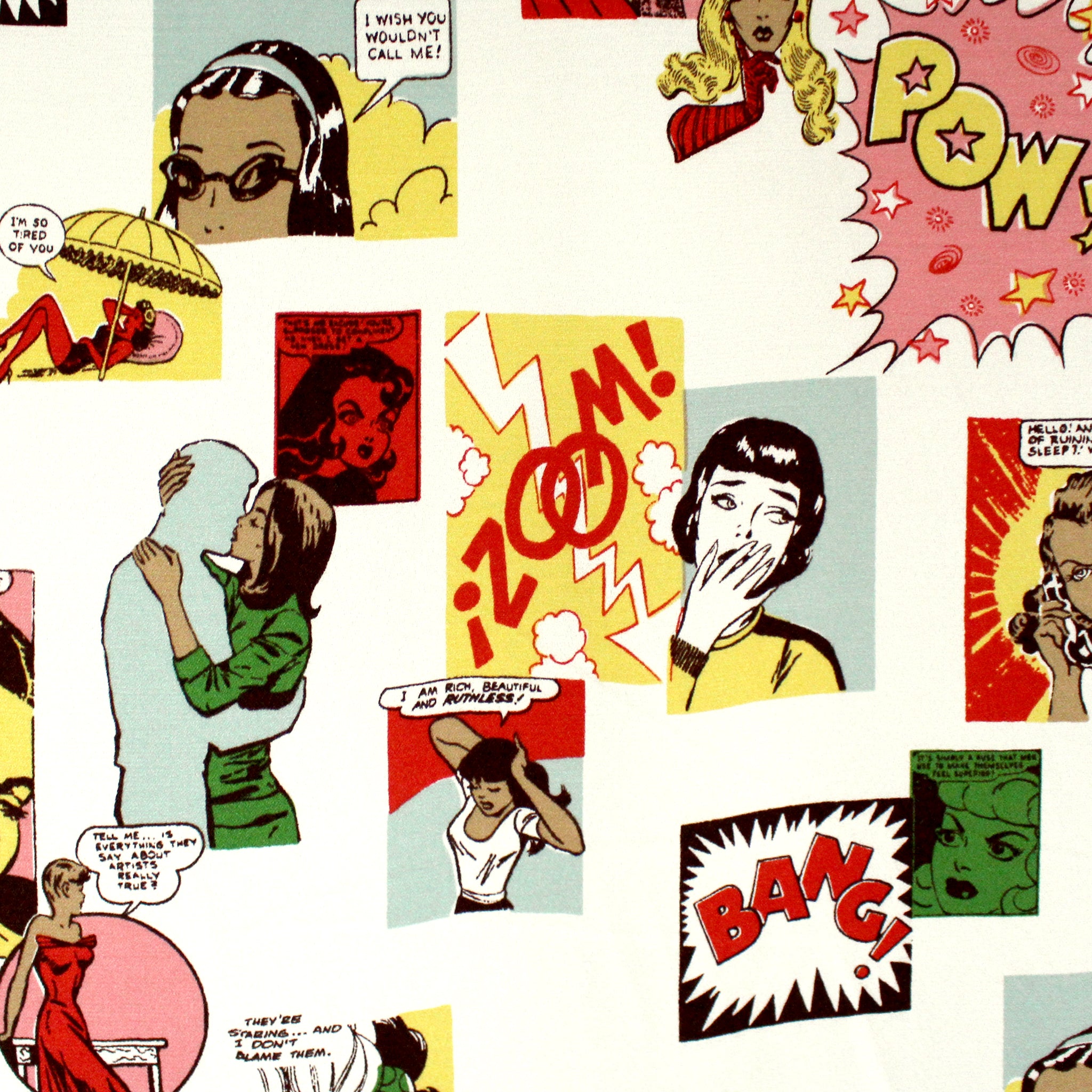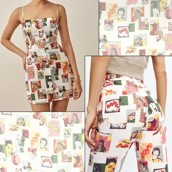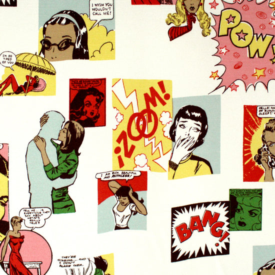 From a sustainable fashion brand, this is a quirky and fun 100% viscose woven with a crepe texture. The "vintage comic" print (25.5" repeat) features vignettes of retro comic book graphics. The color story is vibrant and punchy, featuring reds, pinks, yellows, aquas, greens and brown line work on a creamy white background. The face of this fabric has a matte finish and it is stable in both directions. Very limited yardage available. Perfect for blouses, shirts, dresses, skirts, tops and more. Some styles may require lining or layering due to the light background. Hand wash, hang to dry (please test first) or dry clean.
