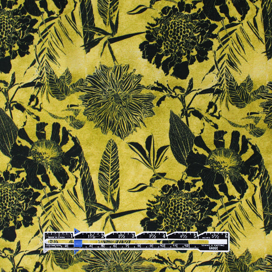 This wonderful cotton/spandex print is imported from The Netherlands, and the quality of the fabric is sublime. Soft and substantial, it has about 30% stretch in both directions, and is opaque with a bit of body in the drape. It is Oeko-Tex certified for non-toxic chemicals and dyes. The lovely floral pattern (5.75" repeat) features black linework on a marled yellow/gold background. This high-contrast design is simple yet striking. Make a lovely tee, top, dress or skirt, leggings, pajamas, etc. The manufacturer recommends hand or machine wash warm, hang to dry. Please test first.