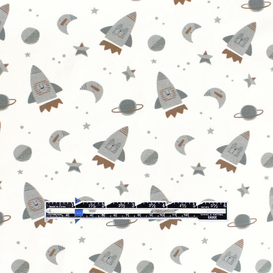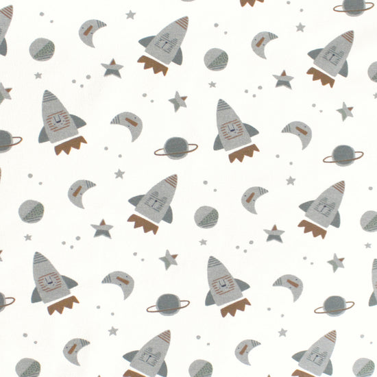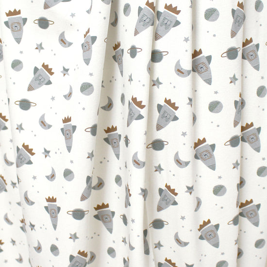 This wonderful cotton/spandex print is imported from The Netherlands, and the quality of the fabric is sublime. Soft and substantial, it has about 30% stretch in both directions, and is opaque with a bit of body in the drape. It is Oeko-Tex certified for non-toxic chemicals and dyes. The print (4.25" repeat) features rocket ships, planets, and stars in shades of gray and blue/green on a creamy white background. Make a great tee, top, dress or skirt, leggings, pajamas, etc. The manufacturer recommends hand or machine wash warm, hang to dry. Please test first.