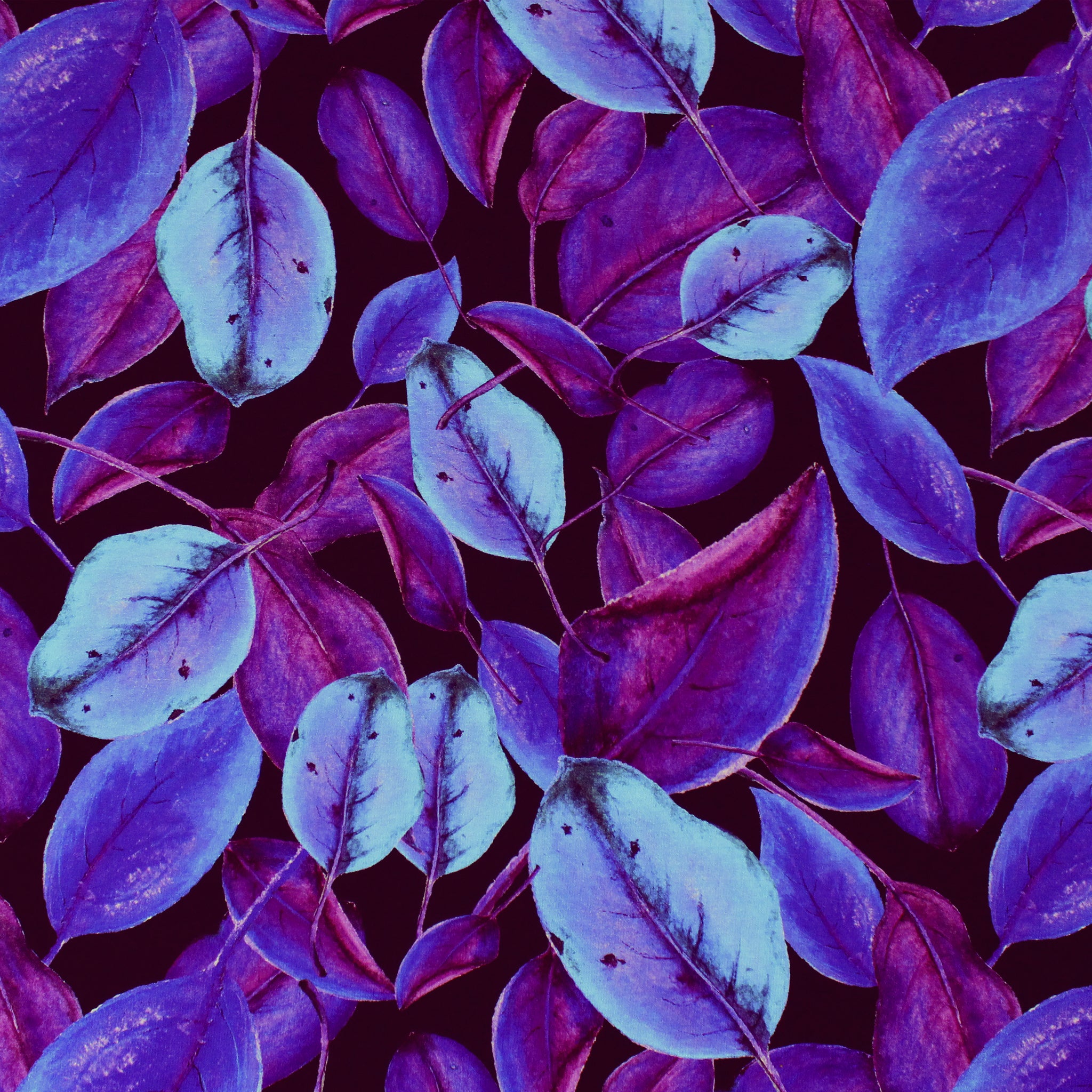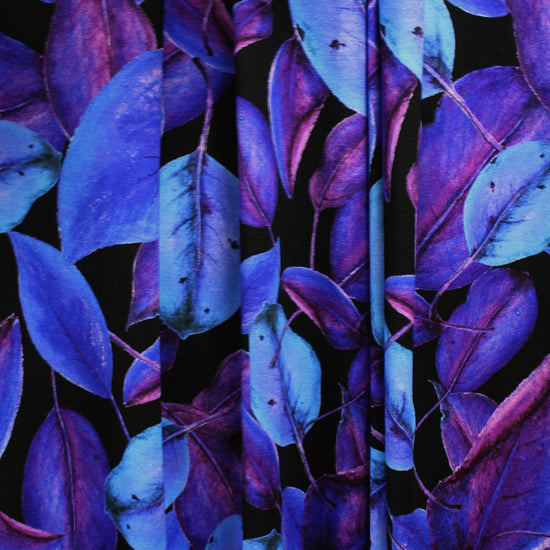 This is a viscose/spandex print imported from The Netherlands! It is wonderfully soft and drapey, with about 40% stretch in the width and length. It is lightweight yet opaque and has a soft hand. This fabric is Oeko-Tex certified, assuring non-toxic chemicals and dyes. The digitally printed "mood forest" design has a 14.25" repeat and features a gorgeous scene of stylized leaves in a range of blues and purples on a black background. Make a great tee, top, tunic, skirt, dress, leggings, lightweight cardigan, etc. The manufacturer recommends hand or machine wash warm, hang to dry. Please test first.