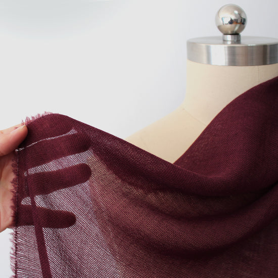From deadstock of the famous Italian designer, this is a beautiful all-wool gauze, a featherweight that is semi-sheer due to the open weave. It is a very light blouse or dress weight with an extremely soft, wooly surface texture and a dry hand. This fabric has a beautiful, soft drape and an elegant character. The overall impression of the color is a rich Syrah. Note the generous 70" width! Make a semi-sheer shirt or tunic, overlay, lined dress or skirt, scarf or shawl, etc. Dry cleaning is recommended.
