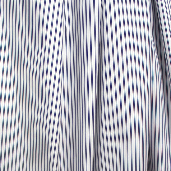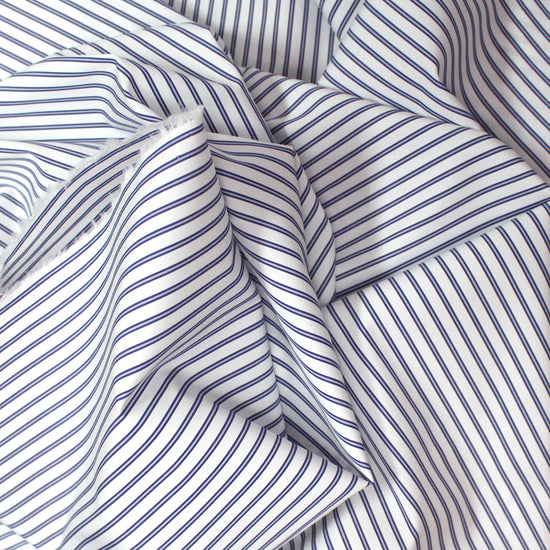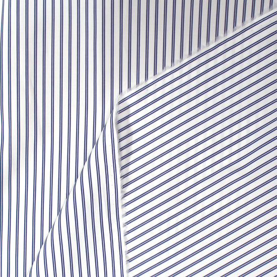 From Italian designer deadstock, this is a beautiful quality shirting with a fantastic, soft and smooth hand. The handsome embellished stripe design runs vertically with a 5/16" horizontal repeat. The yarn-dyed colors are deep navy and white. Woven from a blend of mostly cotton along with synthetic fibers, this fabric is nearly opaque yet lightweight with some cottony crispness in the drape. A wonderful choice for sewing shirts, tailored dresses, skirts, and luxurious pajamas or sheeting. Hand or machine wash gentle, in cold water and hang to dry (please test first).