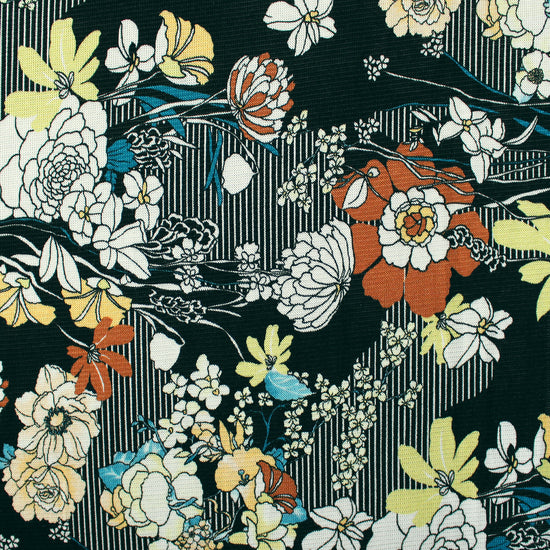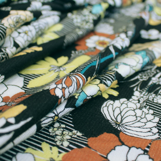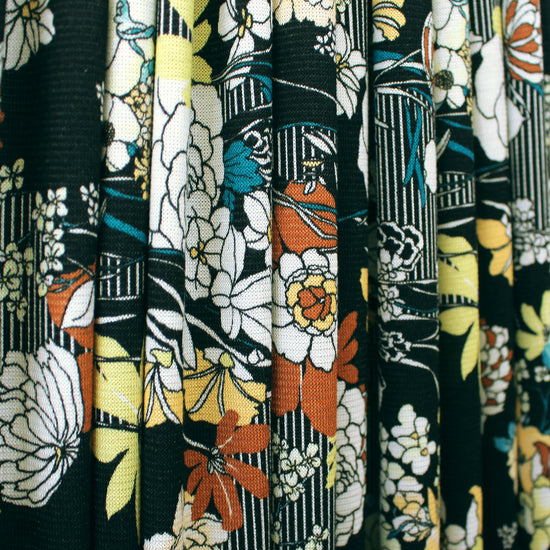 From designer deadstock and made in Italy, this is a lovely, almost featherweight printed sweater knit. The viscose/elastic content lends a subtle sheen and provides about 30% stretch in the width and 10% stretch in the length. It has an extremely soft hand and a slightly fuzzy surface texture. This fabric is very drapey and skims rather than clings for a flattering and comfortable character. It has tiny stitches and is opaque. The "illustration" print features a mix of bold floral blooms and graphic linework with a 14.5" vertical repeat. The color story is rust, a range of yellows, tealy blues, white and true black printed on a white base. Make a lightweight cardigan, wrap, shrug, top, tee, tunic, pullover, dress or skirt, etc. Hand wash, or machine wash gentle in mesh bag, and lay flat to dry, or dry clean.