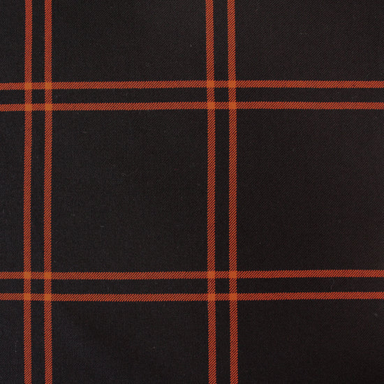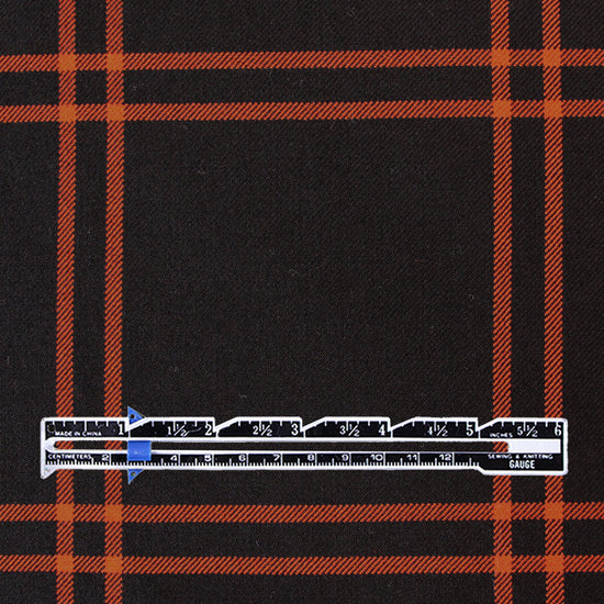 From Italian designer deadstock, this all-wool suiting features a double-windowpane design in persimmon on black. The yarn-dyed plaid has a vertical repeat of 5.25" and the twill weave lends additional interest and stability. This is a mid-weight suiting or lightweight coating, with a dry hand and some body in the drape. Perfect for lined or unlined jackets, suiting, a warm skirt or dress, topper coat, etc. Dry cleaning recommended.