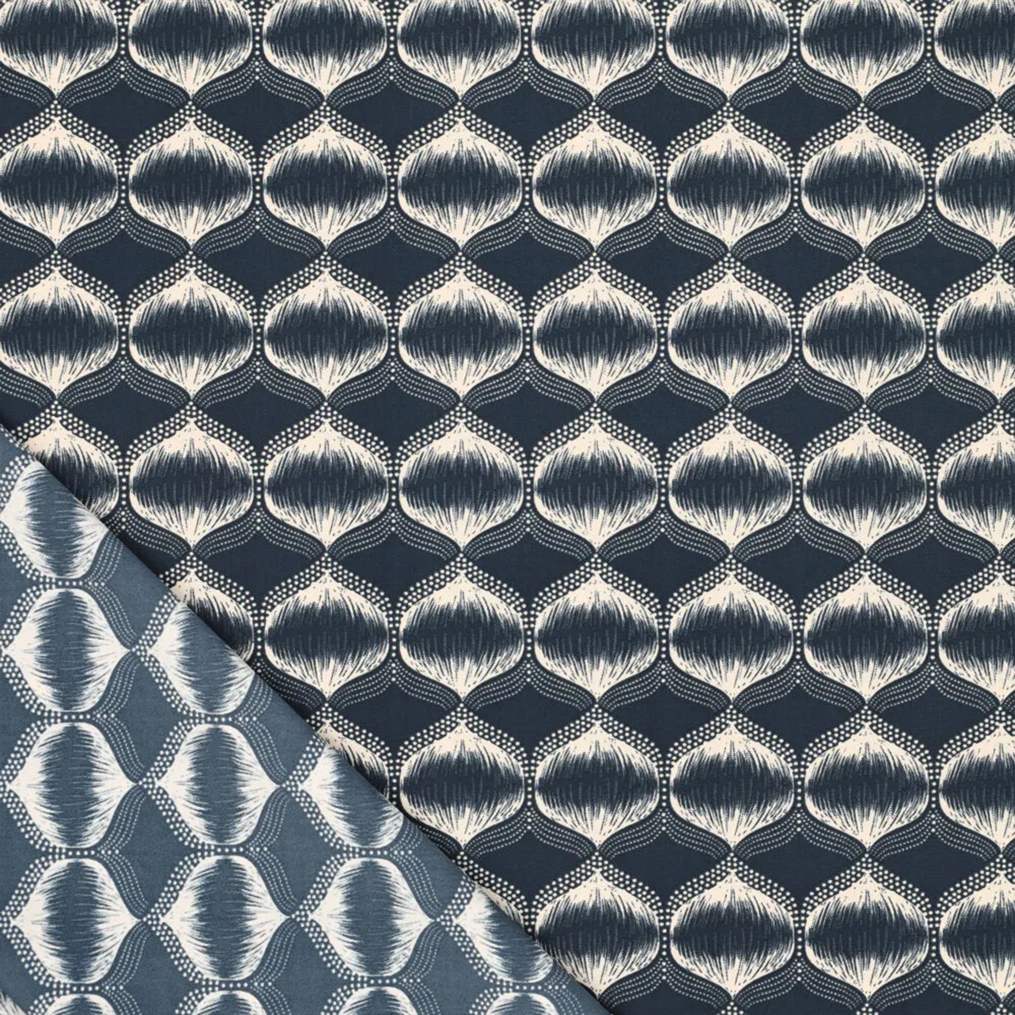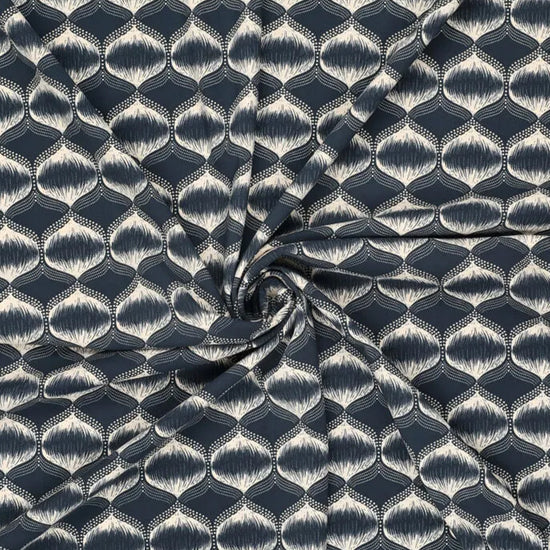 From a Dutch manufacturer specializing in sustainable fabrics, this is a high-quality stretch jersey, opaque with a liquid drape and about 30% stretch in both directions. It is lightweight and wonderfully soft. The very pretty "art deco lantern" design is printed with high definition in slate blue on a creamy white background with a vertical pattern repeat of about 1.5". It is Oeko-Tex certified for non-toxic chemicals and dyes. Sew a divine DVF-style wrap dress, top, tunic, skirt, activewear, leggings, etc. Great for travel as it is wrinkle resistant and packs up tight. Machine wash cool and lay flat or hang to dry. Do not bleach and iron on low.