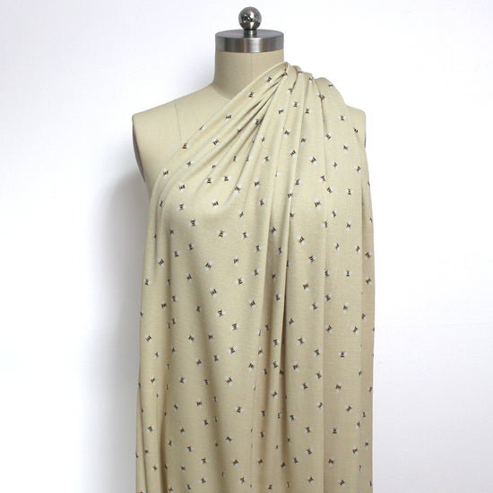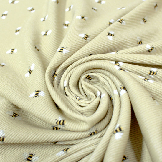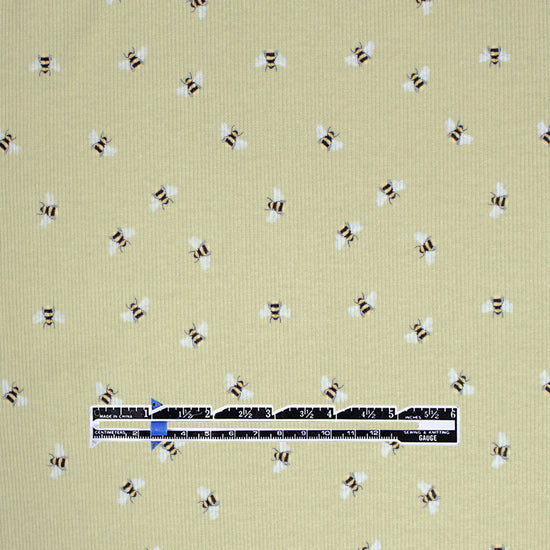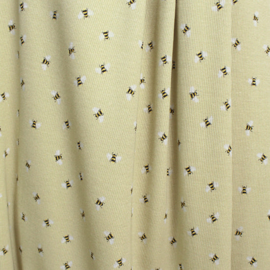 From the Netherlands, this is a wonderful quality stretch cotton rib knit in a versatile medium weight. It is opaque with substance and about 30% stretch in the widthwise with nice recovery. It is soft with a dry hand and a bit of body in the drape. The delightful "busy bee" design is printed on a golden wheat background. This fabric is Oeko-Tex certified for non-toxic chemicals and dyes. Make a great tee, top, dress or skirt, pajamas, lightweight cardigan, etc. Great for children and babies as well. Machine or hand wash cool and hang to dry. Iron on low.