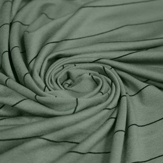 From a US supplier, this is a lovely viscose/spandex 4-way stretch knit, light weight and opaque, with lots of drape. The narrower/wider horizontal stripe (1.25" repeat) features black and silvery sage. With 80% stretch in the width, 40% in the length and great recovery, this fabric is incredibly versatile. Great for tops, tunics, leggings, dresses and skirts a lightweight cardigan, etc. Great quality! Hand wash or machine wash gentle, and hang to dry.