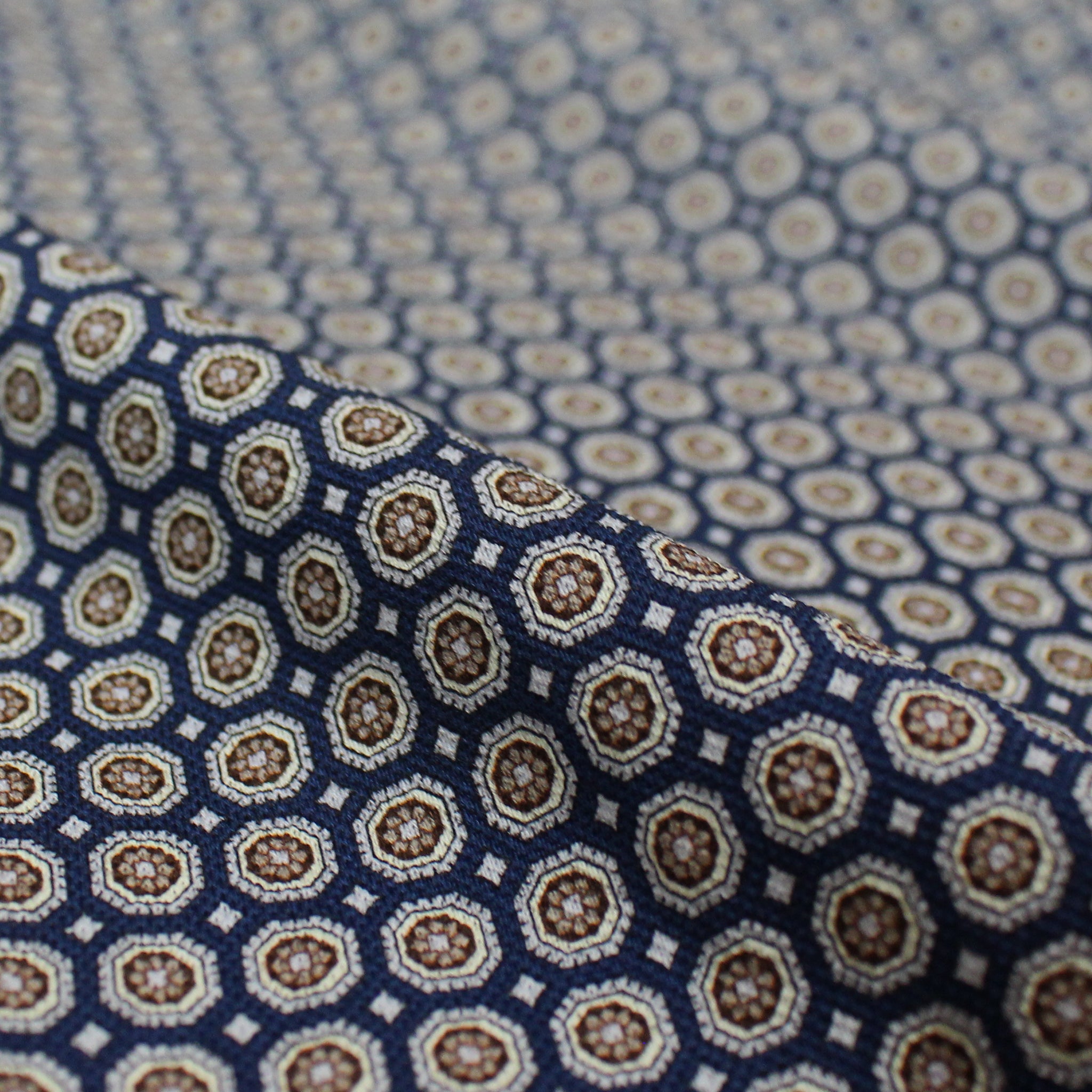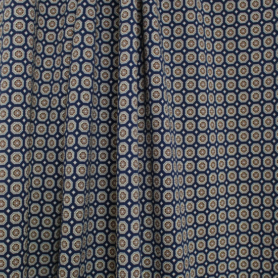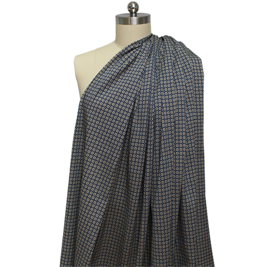 From designer deadstock and made in Italy, this is a gorgeous pique with a lightweight feel and effortless drape. The "mini medallion" design (0.43" repeat) features an ocean blue background with a small-scale medallion pattern in a range of earthtones. It is mostly cotton with a dry hand, and the small elastic content provides about 15% widthwise stretch with excellent recovery. Excellent quality! Perfect for tops, tees, tunics, a dress or skirt, comfy and elegant separates, etc. Hand or machine wash cool and lay flat to dry. Iron on low, but please test first