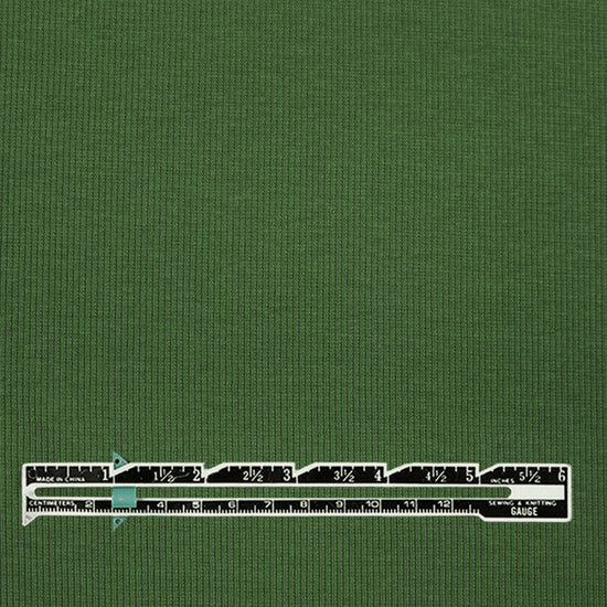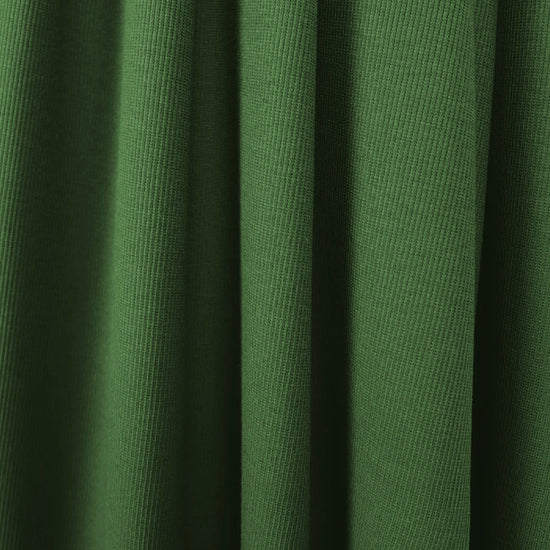 This is a wonderful organic cotton ribbing, an opaque mid-weight knit with a rib stitch that looks the same on both sides. This fabric is Oeko-Tex certified as well as organic, assuring non-toxic fibers, chemicals and dyes. It has about 30% widthwise stretch and is stable lengthwise. The color is a stunning garden green. Note the narrower width, which is typical for ribs. This ribbing pairs perfectly with our line of organic cotton fleece-backed sweatshirt knits and is great for collars, cuffs and hems or for casual separates, knit tops, loungewear, a sweater dress, etc. So soft! Machine wash gentle, hang to dry or tumble on low, do not bleach.