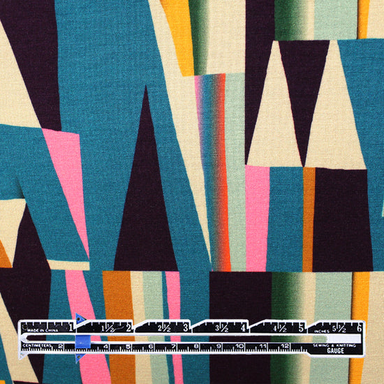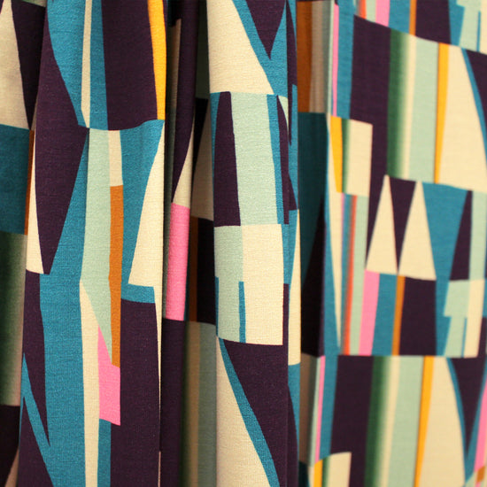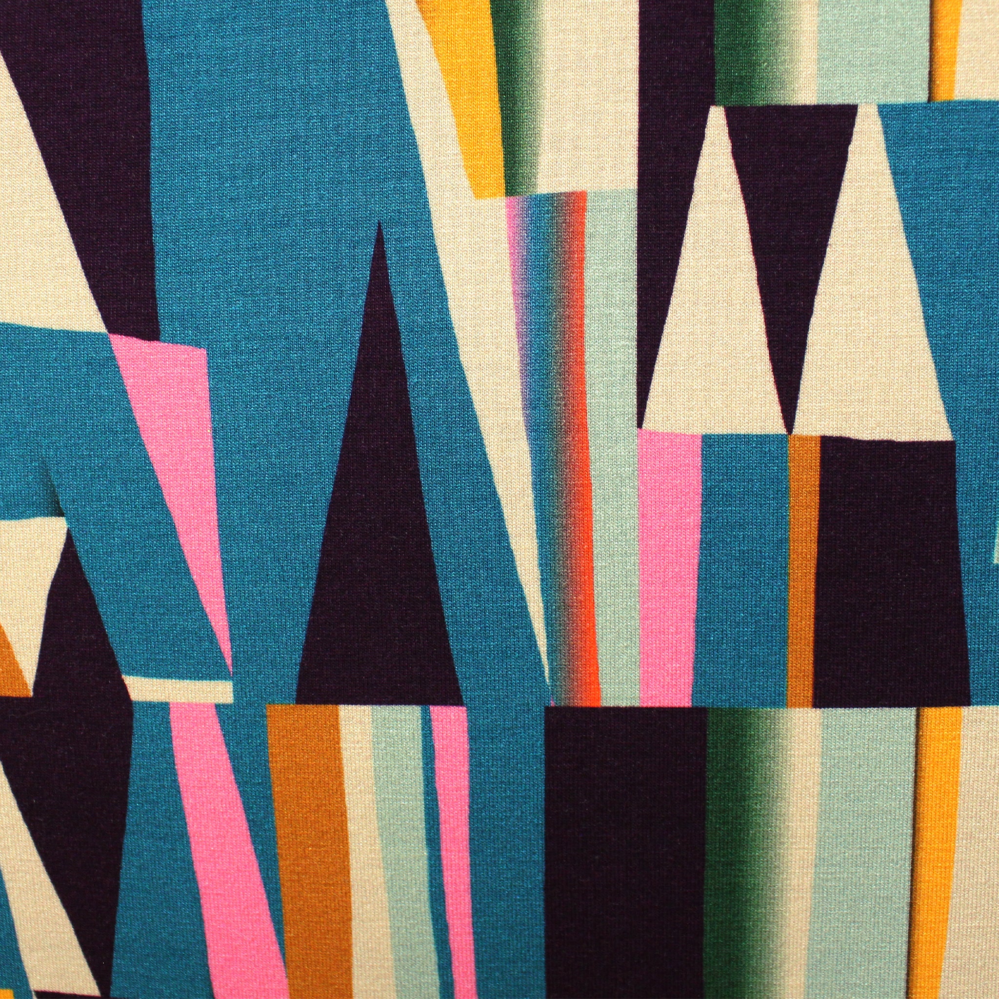 This is a viscose/spandex print imported from The Netherlands! It is wonderfully soft and drapey, with about 40% stretch in the width and length. It is lightweight yet opaque and has a soft hand. This fabric is Oeko-Tex certified, assuring non-toxic chemicals and dyes. The digitally printed "Prism Shift" design has a 6.25" repeat and features a gorgeous abstract geometric print in teal, tan, pink, orange, green and eggplant. Make a great tee, top, tunic, skirt, dress, leggings, lightweight cardigan, etc. The manufacturer recommends hand or machine wash warm, hang to dry. Please test first.