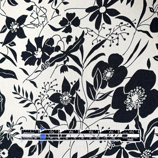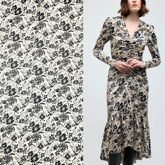 From a sustainable luxury brand and made in Italy, this is a gorgeous blouse or dressweight twill with a pretty satin sheen. The elegant floral design (24" repeat) is printed in black on a champagne background. It is just about opaque, stable in both directions and has a tad of crispness in the drapey. Perfect for dresses, skirts, blouses, etc. Hand wash cool and lay flat to dry. Iron on low.