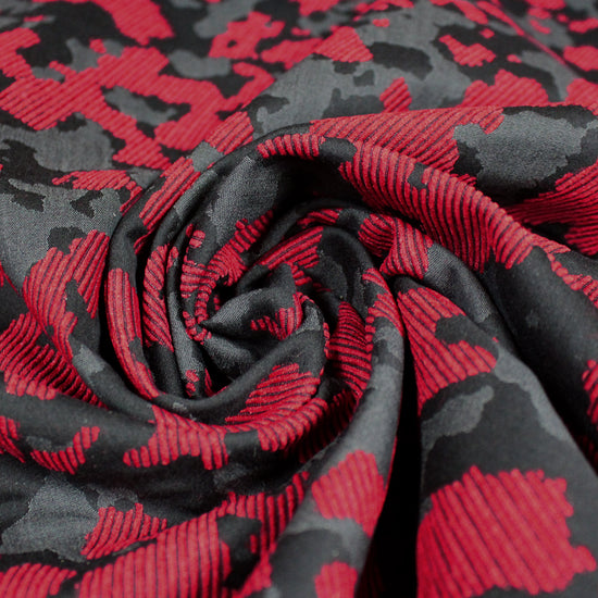 From the French luxury fashion house, this is a very special, textured suiting. We have limited yardage and we cannot get more! The content is a blend of viscose, cotton and polyester. Rich visual and textural interest are created by the variation in weave, fiber and color. The abstract yarn-dyed design has a 9" repeat and features dark cherry, gray and black. It is a medium suiting weight with substance, and opaque with a firmer drape. With 15% stretch in the width only, it is comfortable to wear and has excellent recovery. This fabric provides a light shapewear effect similar to that of a ponte, and the bold textural design is very flattering as well. The reverse is soft and attractive, but it's not really meant to be seen due to the float threads. Make a one-of-a-kind jacket, suit, dress or skirt, etc. Dry cleaning is recommended.