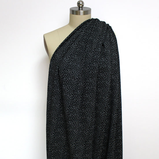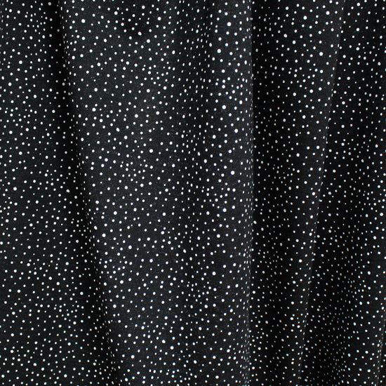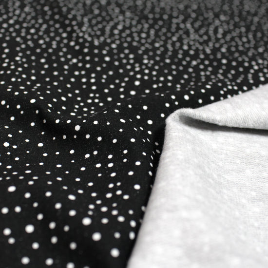 This is a wonderful cotton/spandex stretch French terry, imported from The Netherlands. It has a plain knit stitch on the face and an incredibly soft, brushed terry texture on the back. A softness to rival our line of Dutch fleece fabrics! This fabric is opaque with some body in the drape, and it's a medium weight (comparable to a lighter fleece sweatshirt). The fabric is soft and substantial, with about 20% stretch widthwise and lengthwise. It is Oeko-Tex certified for non-toxic chemicals and dyes. The "night sky" design (about 1.25" repeat) is printed in white on a soft black background (the base fabric is white). Make a tee, top, hoodie, tunic, skirt, dress, etc. The manufacturer recommends hand or machine wash warm, hang to dry. Please test first.