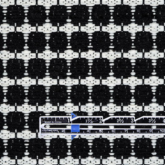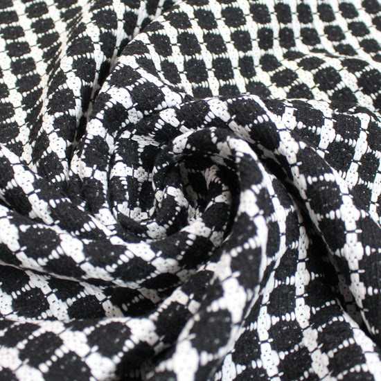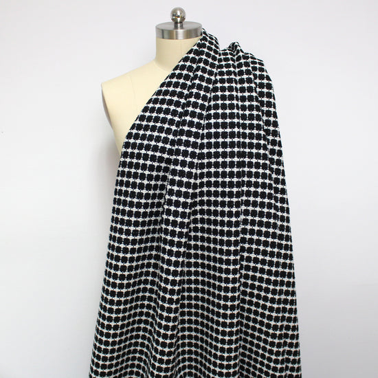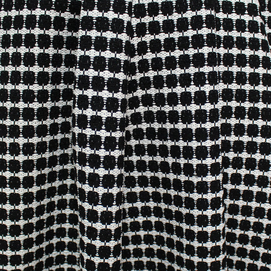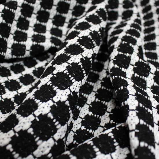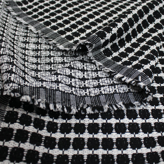 From designer deadstock and made in Europe, this is an expertly woven gem of a fabric. It is a lighter suiting weight, but its dimensional weave provides such surface texture that it appears more substantial. It is stable in both directions with some firmness in the drape. The "black and white cookie" pattern (1" repeat) features raven black and snow white. Make a stunning and classic jacket or topper coat, special occasion suiting, etc. Though the reverse is a very pretty inversion of the design, lining is recommended to protect the float stitches. Dry cleaning is recommended, but if you choose to handwash please test first.
