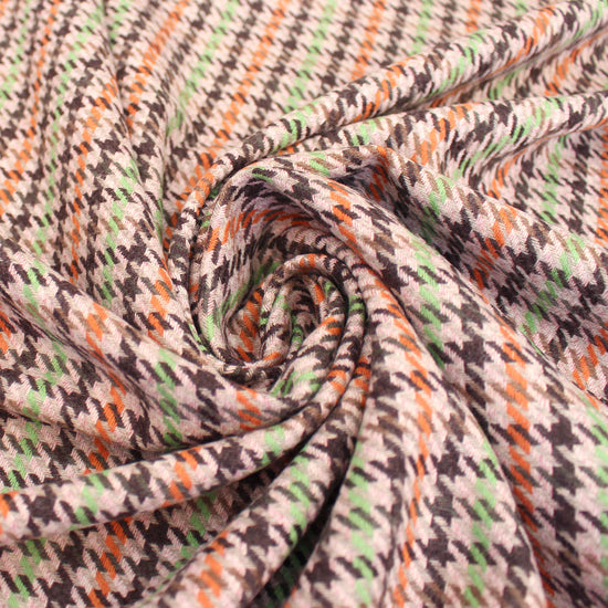 From designer deadstock and made in Italy, this is a beautiful, medium weight wool blend with a lovely houndstooth pattern in a unique color palette. It is opaque, stable, soft and malleable with some body in the drape. A classic style in an excellent designer quality. The yarn-dyed houndstooth design has a 1.75" pattern repeat featuring green, orange, chocolate brown, and a taupey pink. It looks the same on both sides and does not require lining. If you decide to go with an unlined style, reference Kathryn's wonderful tutorial for tips on binding edges HERE. It is the perfect choice for a great many projects including a suiting, coating, lightweight jacket, dress, skirt, trousers, etc. Machine or hand wash cool and lay flat to dry (please test first)