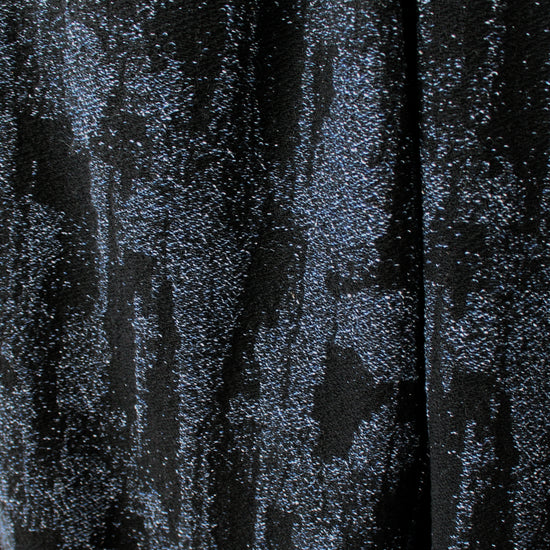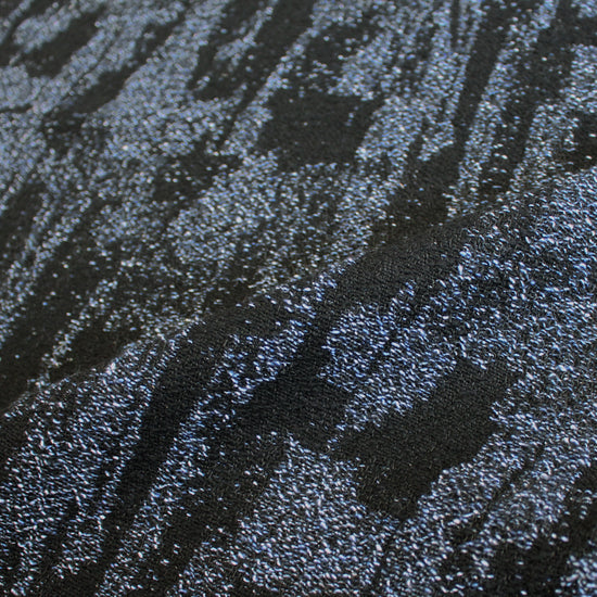 From designer deadstock and made in Italy, this is an extraordinary, textured woven in a heavier suiting or medium coating weight. With the wool and cotton content, this stunning and unique boucle has a rich texture and some heft. The abstract yarn-dyed design (12" pattern repeat) is intriguing and unique, featuring tweedy, speckled yarns in soft white and blue on a black background. This fabric is opaque with a firmer drape and would make a stunning jacket, suit or coat. Dry cleaning is recommended.