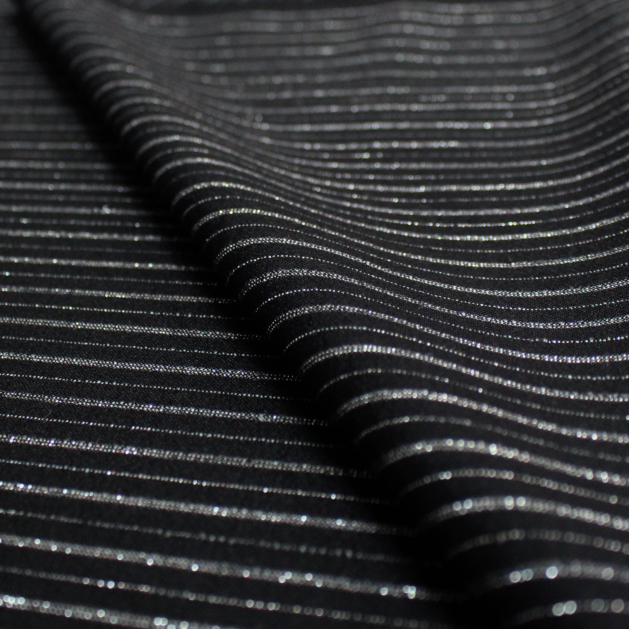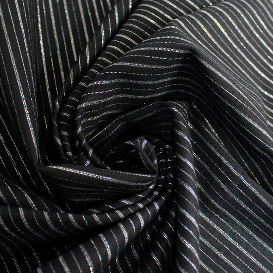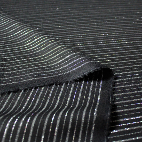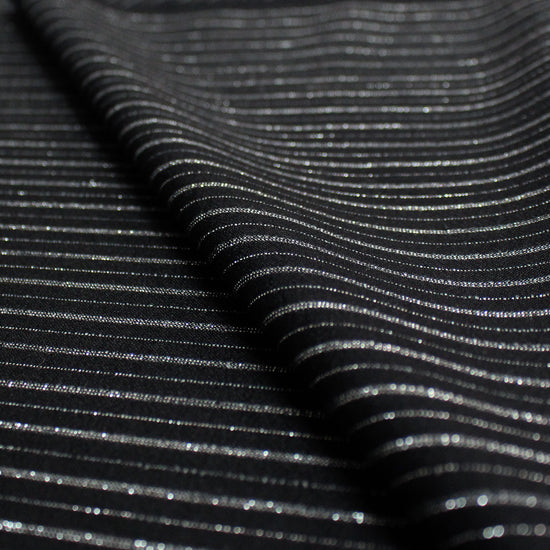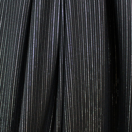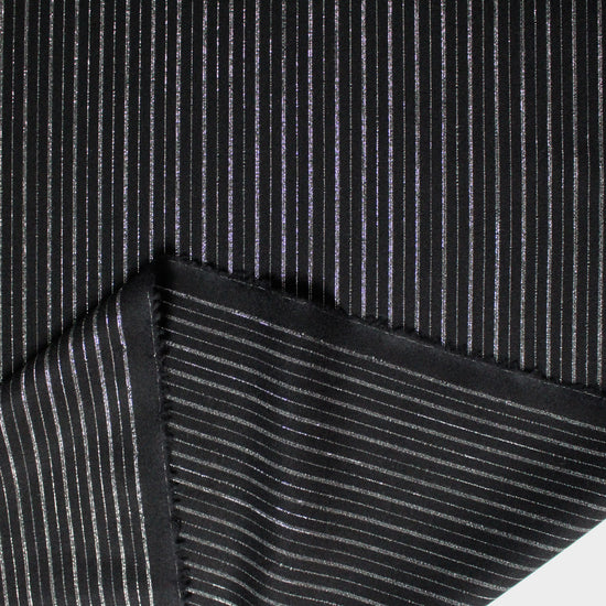 Made in Italy for the iconic brand, this is a festive but sophisticated all-wool woven with a vertical stripe in silver gray and metallic silver lurex on a jet-black base. It is opaque and tightly woven with some fuzziness to the surface texture and a bit of give in both directions. This fabric has a wonderfully soft, dry hand and the weight is incredibly versatile as it could serve as a shirting, a medium dressweight or a light suiting/bottomweight. versatile medium weight with a very soft, dry hand and no stretch. The yarn-dyed design features an alternating single and double-stripe pattern running vertically with a .5" horizontal repeat. Differing amounts of metallic silver and matte silver yarns are used throughout the design to create a very pretty glistening effect. Sew a very special dress shirt, overshirt, vest, lined or unlined transitional jacket, dress or skirt, trousers, etc. Hand wash and lay flat to dry, or dry clean. Iron on low (please test first!).