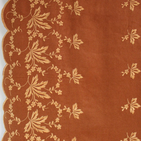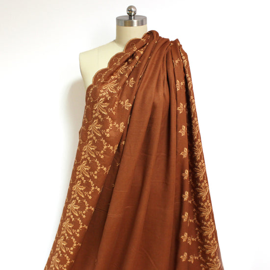 From European deadstock, this is a very unique, embroidered flannel with a beautiful scalloped edge on both sides. This fabric is incredibly soft, and the brushed face almost feels like a lightweight suede. It is completely opaque and stable in both directions. The medium-scale floral motif embroidery features golden wheat threads on a cinnamon background. The medium weight is suitable for a great many garments including an overshirt or elevated separates, lined or unlined transitional jackets, dresses and skirts, scallop-edge pants, robes, etc. Hand wash separately, cold and lay flat to dry, or dry clean. (please test first!).