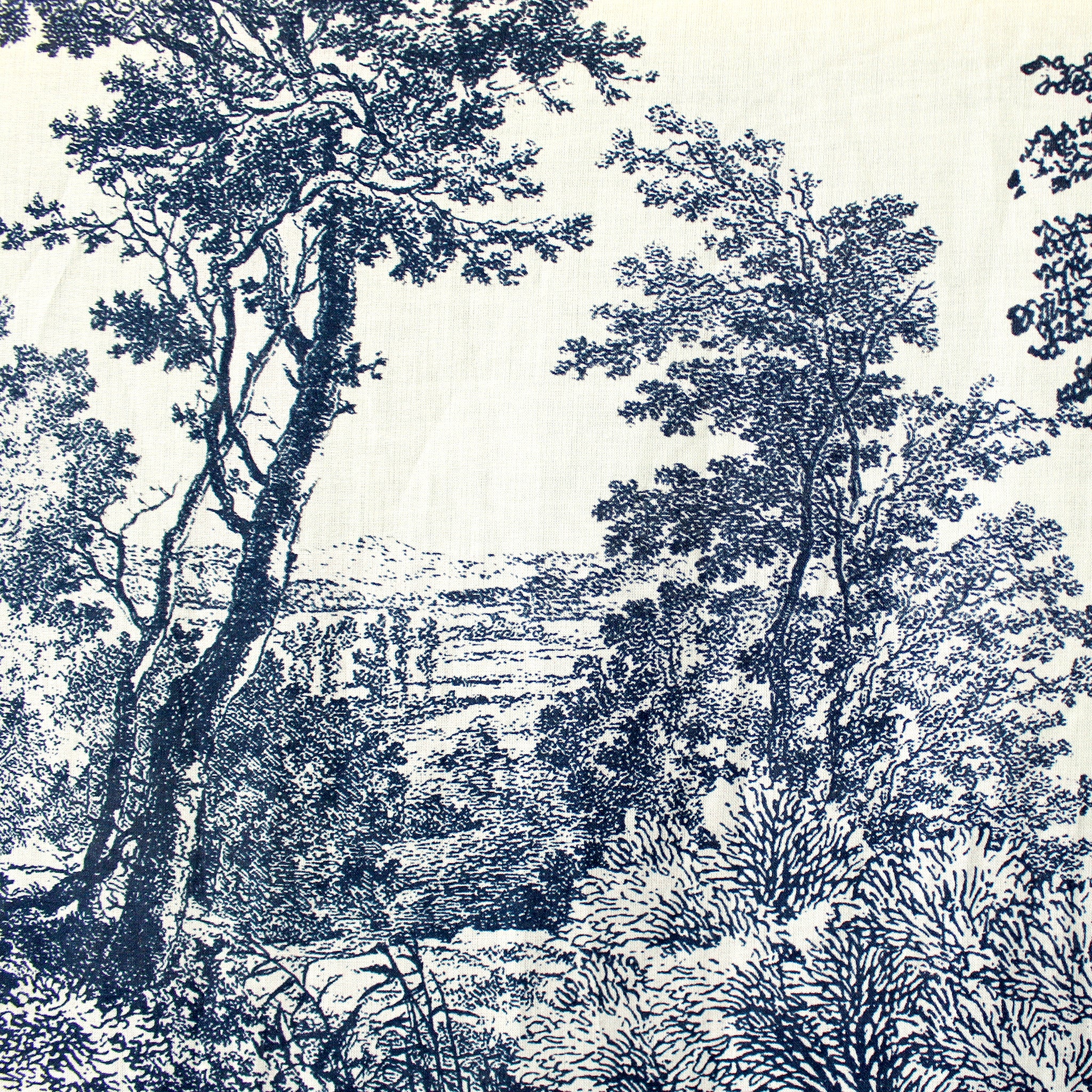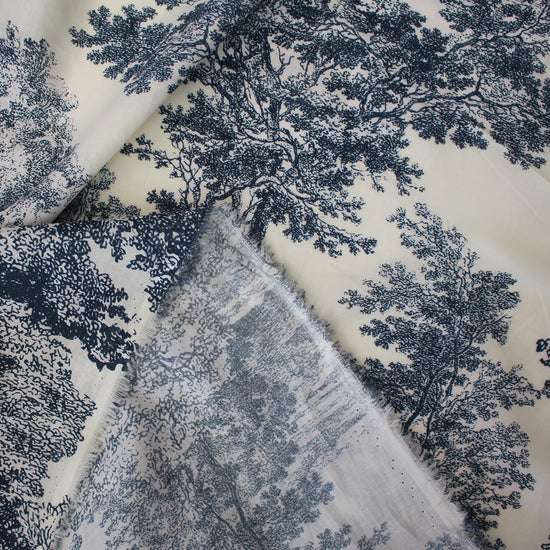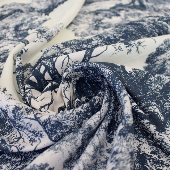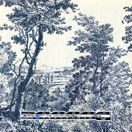 From Italian designer deadstock, this is a beautiful quality cotton lawn with a fantastically soft and smooth hand. The classic "Toile de Jouy" design (46" repeat) features pastoral scenery in inky indigo with sections of both warm and cool-leaning shades of antique white as a background. It is light as a feather and semi-opaque with a floaty drape. A wonderful choice for sewing shirts, blouses, dresses and skirts, shawls, or sheeting. Some styles may need lining or layering. Hand or machine wash gentle, in cold water and hang to dry (please test first).