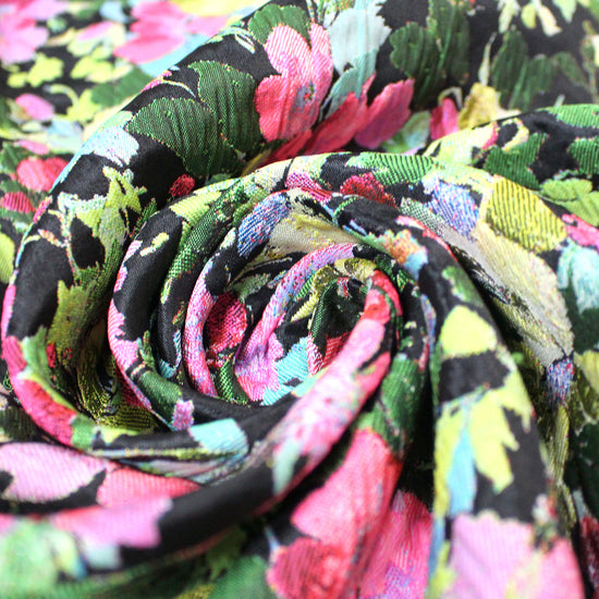 From The Netherlands, this is a stunning Oeko-Tex certified, slightly dimensional brocade fabric with so much to offer. An opaque, medium weight woven with firmness in the drape. The yarn-dyed "spring awakening" design (15.5" pattern repeat) is an absolute showstopper; nodding both to modern and vintage aesthetics! Featuring florals and greenery in bright pinks, lilacs, greens, and aquas on a black background this colorway is universally flattering. The reverse side offers a totally different feel, with the florals being deepest forest green with gray foliage on a matcha green background. Either side could be used as the face if you wish! Make a stunning (and maybe reversible!) shift dress, outerwear, skirt, coordinating set, even accessories. Don't miss out, limited yardage available!