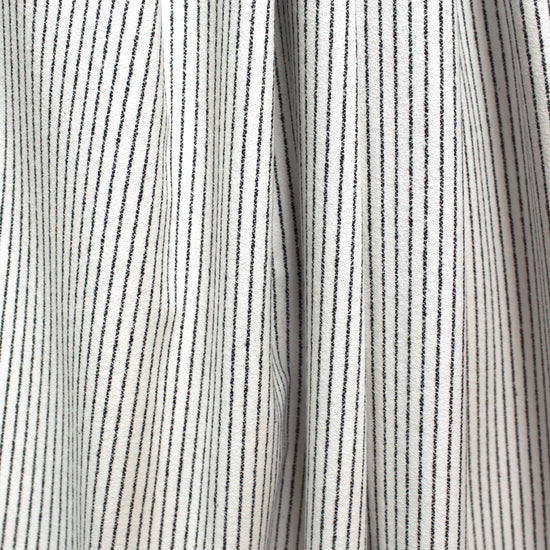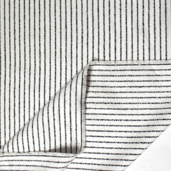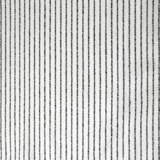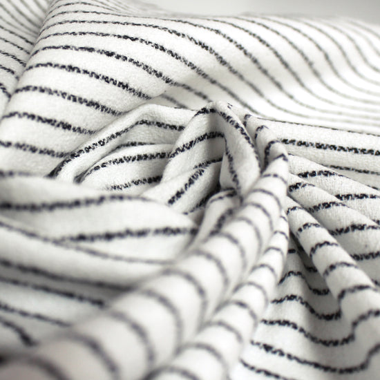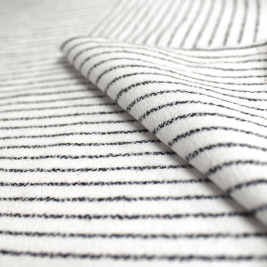 From a US supplier, this is a lovely all-cotton crepe woven with a lightly brushed plain weave on both sides. It is so cozy and inviting! A versatile medium weight with a very soft, dry hand and no stretch. It is completely opaque with some body in the drape. The "ticking stripe" design runs vertically with a 5/16" horizontal repeat and features black ticking stripes on a soft white background. The weight is perfect for an overshirt or elevated separates, lined or unlined transitional jackets, dresses and skirts, trousers, etc. Please note the 44.5" cuttable width and order accordingly. Hand wash separately, cold and lay flat to dry, or dry clean. Medium iron (please test first!).