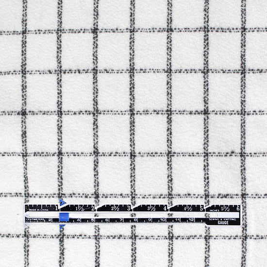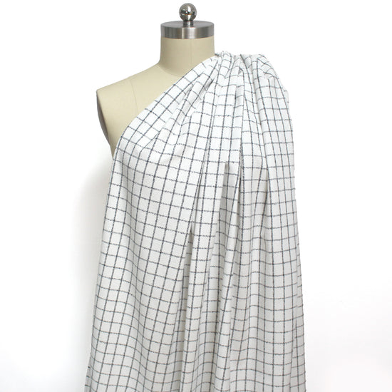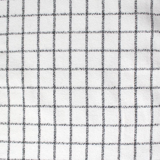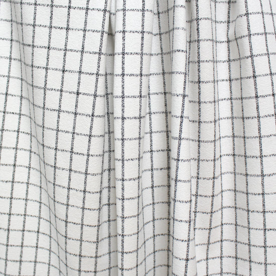 From a US supplier, this is a lovely all-cotton crepe woven with a lightly brushed plain weave on both sides. It is so cozy and inviting! A versatile medium weight with a very soft, dry hand and no stretch. It is completely opaque with some body in the drape. The windowpane check design has a 1" repeat and features black on a soft white background. The weight is perfect for an overshirt or elevated separates, lined or unlined transitional jackets, winter dresses and skirts, trousers, etc. Please note the 44.5" cuttable width and order accordingly. Hand wash separately, cold and lay flat to dry, or dry clean. Medium iron (please test first!).