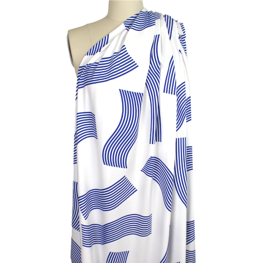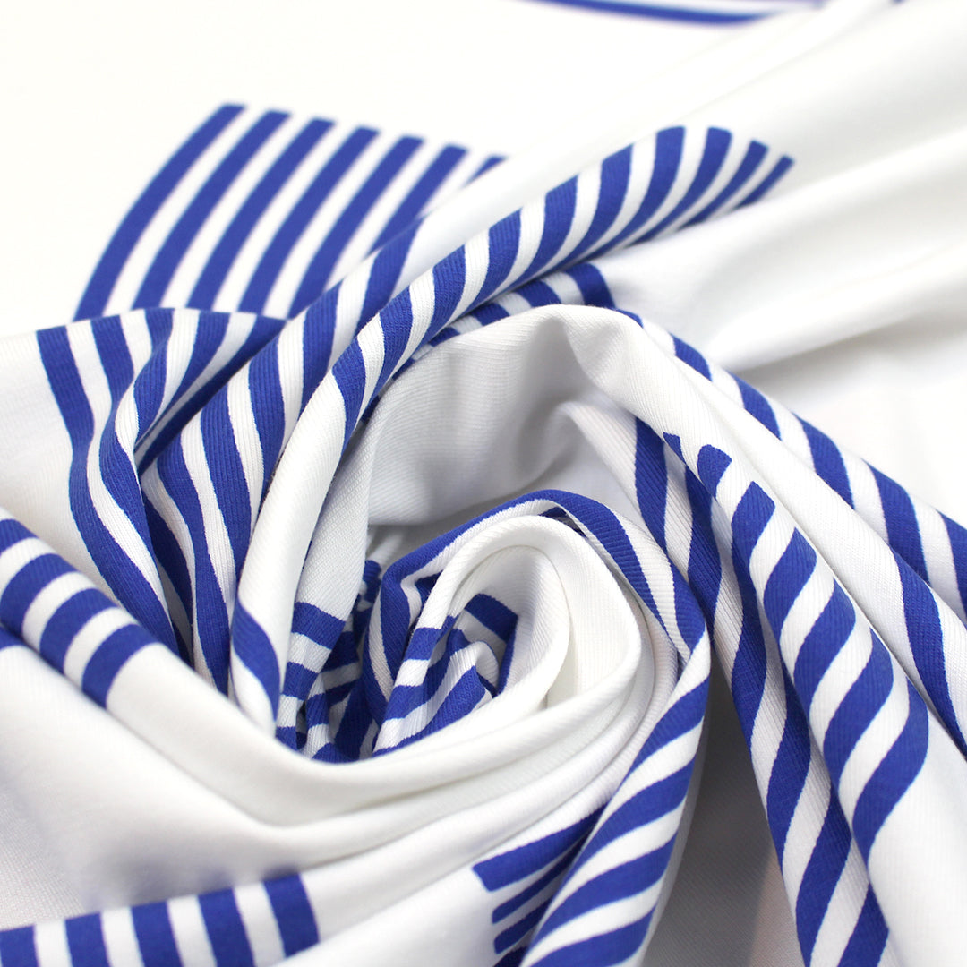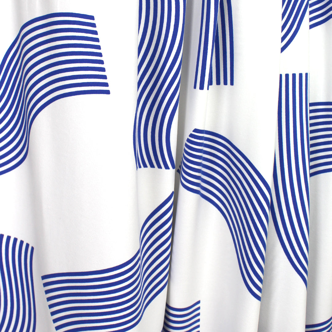 Made in Turkey, this wonderful cotton/spandex print is lightweight and of beautiful quality. The bold 'Breton' design has a 29" repeat featuring blue striped swathes on a white background (PANTONE 18-3945, etc.). Soft and substantial, it has about 20% stretch in both directions and is opaque with a bit of body in the drape. A modern and playful take on the French fisherman's motif! Make a great tee, top, tunic, skirt, dress, lightweight cardigan, etc. The manufacturer recommends hand or machine wash warm, lay flat to dry. Iron on medium. Please test first.