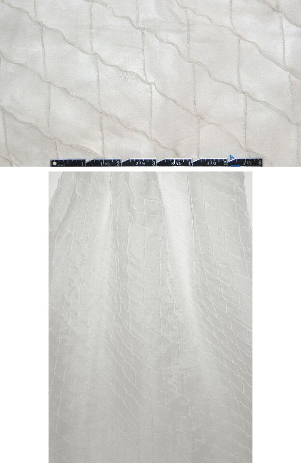 This pintuck diagonal grid design silk organza is so pretty, sheer and crisp, well-priced, and a pretty overlay for a dressy garment. The color is soft white. Elegant and simple! Dry cleaning recommended. 1.625 yds.
