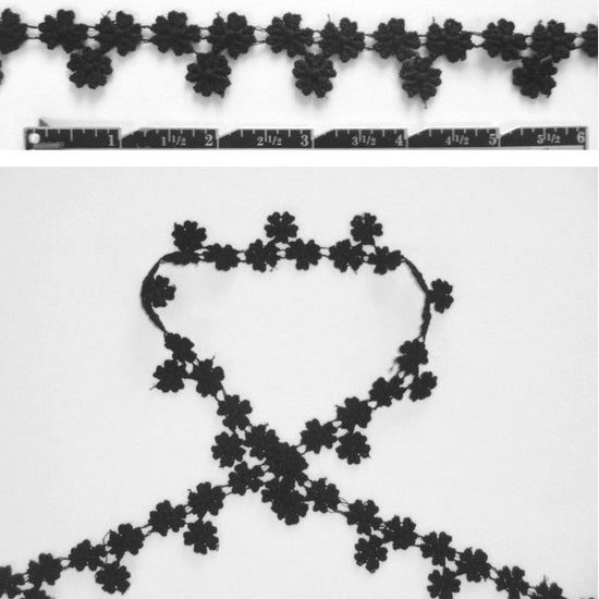From a new group of trims just in from a very famous designer, this black cotton flower trim features little flowers clusters in a narrow strip, a perfect finishing touch on a garment for special occasion or every day!. LAST PIECE, 1.5 yds.