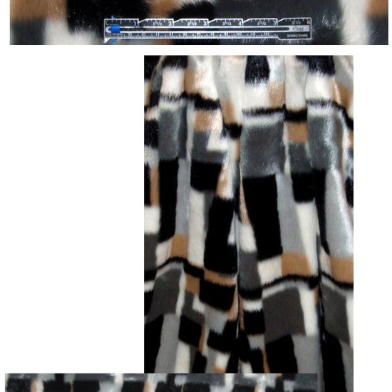 This fun faux fur from a NY designer is thick (1" pile) and silky soft with a stable knit backing. The design is a boxy geometric with a 19.5" repeat in tones of brown, white, gray, black, sand, etc. Scrumptuous! The backing is a flat knit with the same geometric pattern as the fur, but you will probably want to line your garment with a Bemberg or silk charmeuse. It's very drapey, supple and thick, so it would make a stunning coat, jacket, vest, or trim. Dry clean only. 2 yds. (This is all that is available in this colorway)