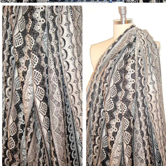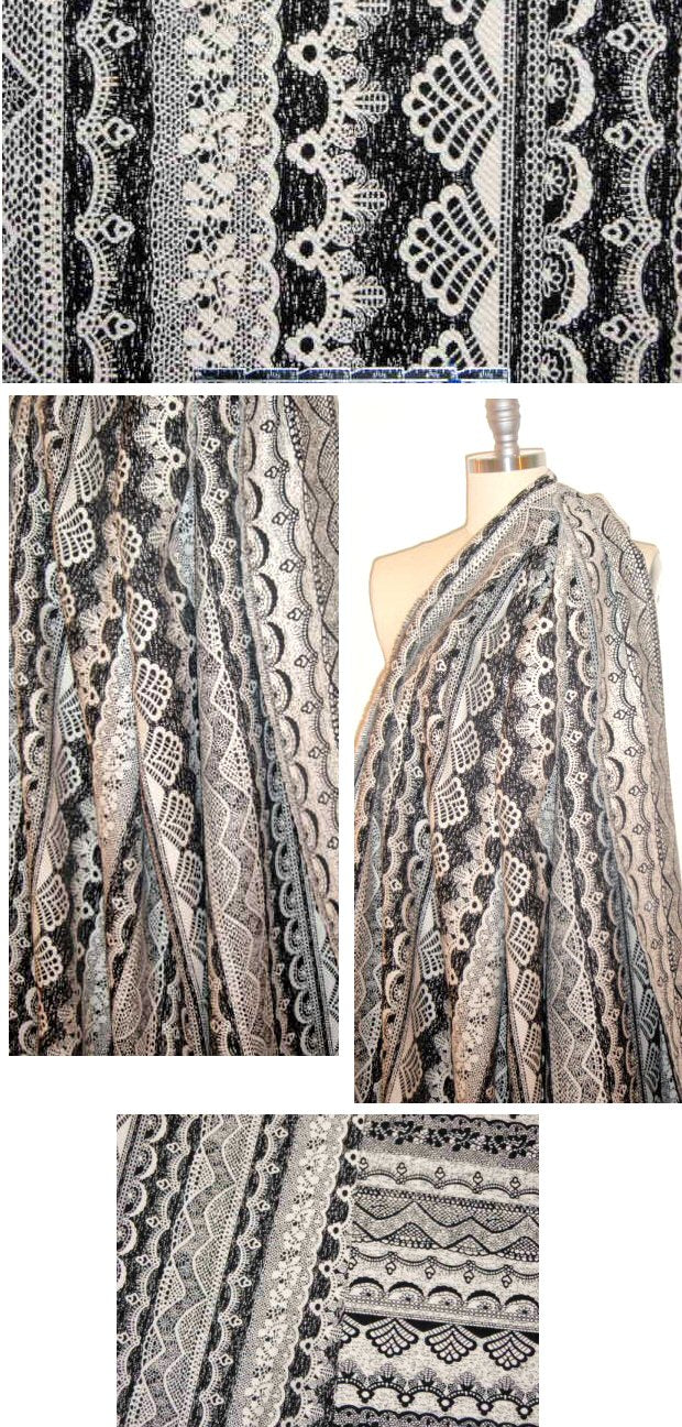 From Italy, this is a gorgeous quality reversible jacquard suiting, a cotton blend that has some drape with lot of body. The lace-inspired, vertically-oriented design (14.24" repeat) is just stunning, in an intricate weave of black and natural. Both sides are beautiful, and I've attempted to show them below. It's a medium weight suiting, perfect for fabulous ladies jacket or coat, skirt, fitted dress, etc. Dry clean or test first if you want to try hand or machine washing. Hang to dry. LAST PIECE, 1.5 yds.