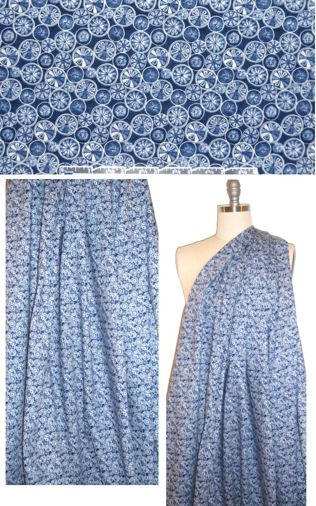 This is a fabulous cotton/lycra woven with about 20% widthwise stretch, a cottony dress/shirting weight with a very dry hand and smooth surface texture. It's medium-light weight, opaque, with a cottony crisp drape. The delightful graphic features a "wheel" print that resembles fruity cross section/sand dollar shapes in shades of navy and white (PANTONE 19-3926). Perfect for a fitted shirt or top, tunic, dress, light jacket, skirt, capris, etc. Hand wash separately, cold, hang to dry, medium iron. (Machine wash gentle is probably OK but manufacturer recommends hand wash.)
