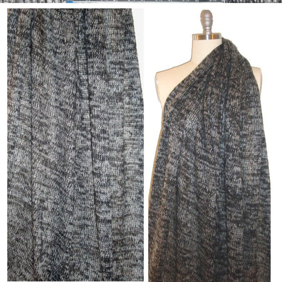 From an Italian mill, this beautiful poly/wool blend sweater knit is a fashionable basic with a wonderfully soft hand and drape. It's an open stitch sweater knit, so it's semi-sheer and very drapey, with 40% stretch in the width only. The color is a gorgeous mix of black and silvery white. It's perfect for drapey layering, a lovely scarf, or any sort of drapey top, cardigan, shrug, etc. Dry clean, or treat as you would any fine sweater knit. 2 yds.