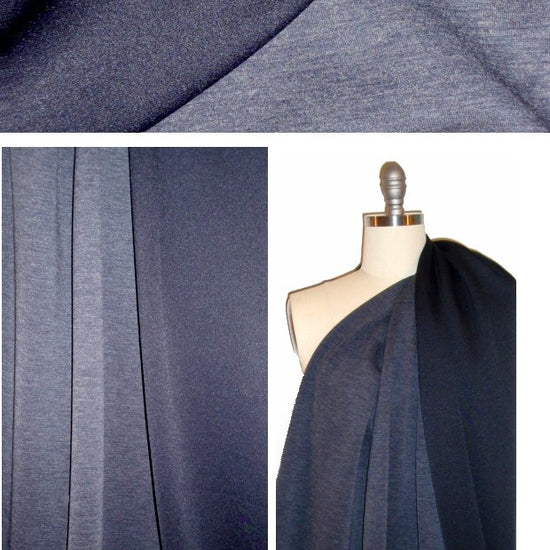 Finally a scuba knit with some rayon content...Hurray! This "Scuba Air" double-sided fashion neoprene fabric has the look, feel, weight and stretch of an all-polyester scuba/neoprene, but feels lighter and more comfortable to wear. Designers from every fashion market are using this micro-doubleknit fabric for everything from high fashion garments to active and sportswear. It's opaque, substantial, with body in the drape and about 15-20% stretch widthwise. The face is a heathery navy, and the back is solid navy (PANTONE 19-3908). Use this versatile fabric for jeggings or skinny pants, body-conscious dresses, skirts, jackets, color blocking, etc. Machine wash cool, lay flat to dry, or dry clean. 2 yds.
