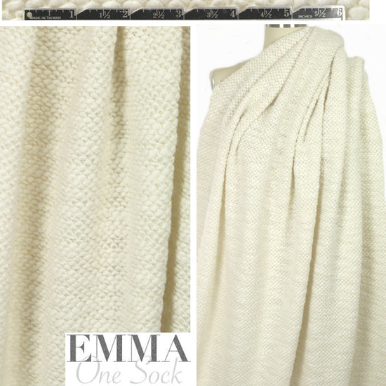 Another beauty from Italy, this amazing chunky boucle' textured wool blend sweater knit has large "nubs" on a plain and pretty knit backing. It is thick and cozy with body in the drape, and about 25% widthwise stretch. The color is a creamy winter white (PANTONE 11-0602-ish). So soft and warm! Make a thick cardigan, sweater jacket, hat, sweater coat, etc. Dry cleaning recommended, or test first if you wish to hand wash and lay flat to dry.