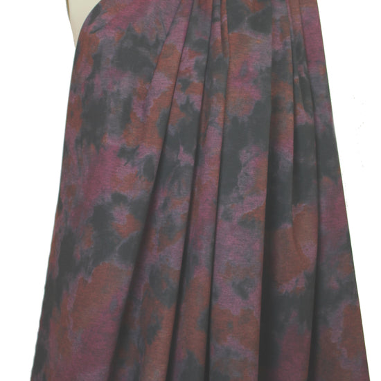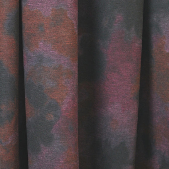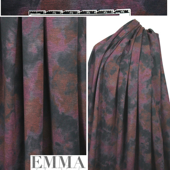 A new printed ponte! The base fabric is a beautiful quality black ponte, and the watercolor floral, in tones of wine, indigo, brick, etc. (PANTONE 18-1709, 18-1425, 19-1102, etc.) comes up dark and subdued because of the black base color on which it is printed. This perfect medium weight ponte has about 35% stretch in the width, 15% in the length, with great recovery. There's no bleed through to the reverse side, so it makes an excellent solid contrast color! This fabric has lovely drape with substance and body, perfect for fashion-forward skinny pants, body hugging knit dress, tunic, skirt, knit suit, etc. Manufacturer recommends machine wash, tumble dry low, or dry clean. No bleach. END OF ROLL, .75 yds.