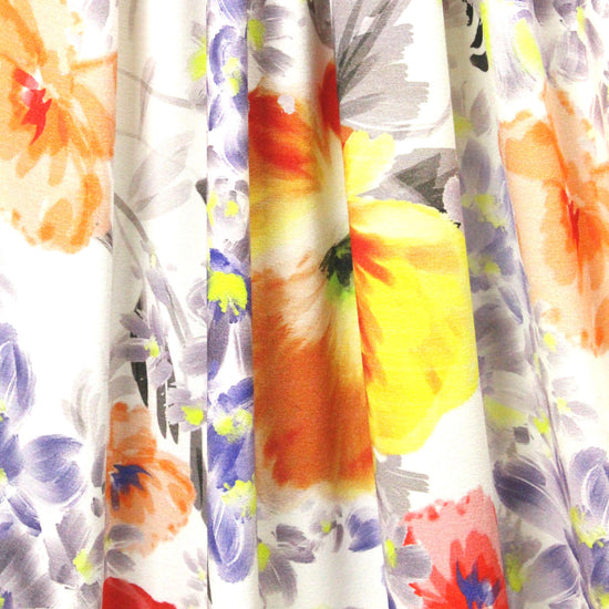 This is a lovely rayon/spandex knit with 4-way stretch (80% in the width, 40% in the length with great recovery), and it is lightweight and opaque with lots of drape and a smooth, dry hand. The digital "brushstroke floral" design (31" repeat) features shades of orange, red, grape, lime, tinted gray and black, etc. on a creamy white ground (PANTONE 15-1247, 17-1563, 16-3931, 12-0633, etc.). Perfect for tops, tees, tunics, dress, maxi dress, etc. Machine wash, hang to dry or tumble dry low.