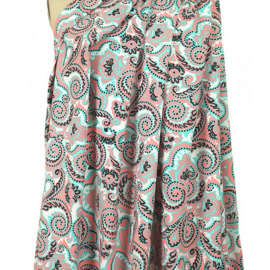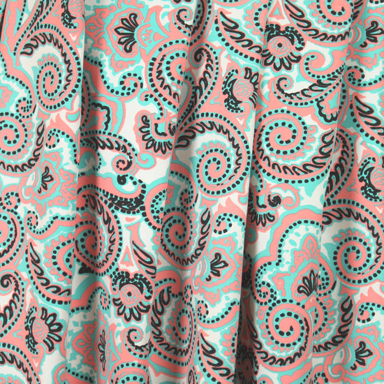 This is a wonderful 4-way stretch Italian swimwear fabric from a NY designer, medium-light weight and opaque with about 60% stretch in both directions. The quality of the fabric is excellent--it's just the right weight-- and the decorative paisely print (11.125" repeat) is fresh and modern. The colors are aqua, coral, black and white (PANTONE 14-4811, 15-1621). Perfect for swimwear, athletic wear, or sporty tops, tees, tunics, leggings, etc. Test first if you wish to hand or machine wash, and hang to dry. 1.25 yds.