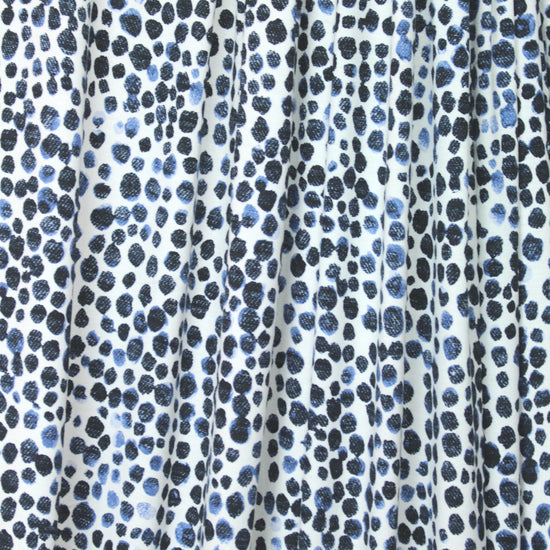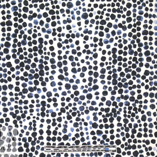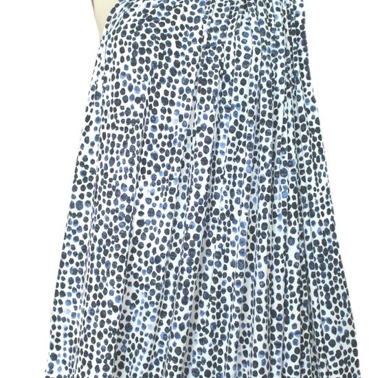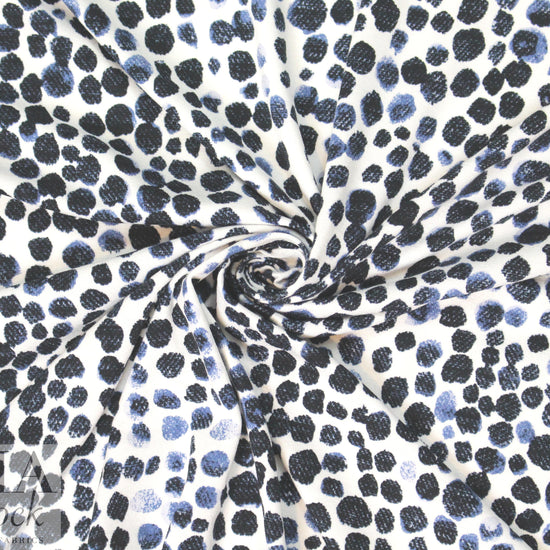 This is a fabulous viscose/lycra 4-way stretch knit, lightweight yet opaque, with lovely drape. The "blue jean dots" print (26.5" repeat) features denim-like dots in an informal arrangement, in denimy blues and white (PANTONE 19-4104, 16-4120, etc.). 80% stretch in the width, 40% in the length, with great recovery. Great for tees, tops, tunics, dresses, etc. Beautiful quality! Test first if you would like to hand or machine wash, and hang to dry. 1 yard.