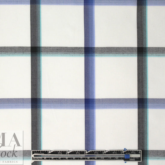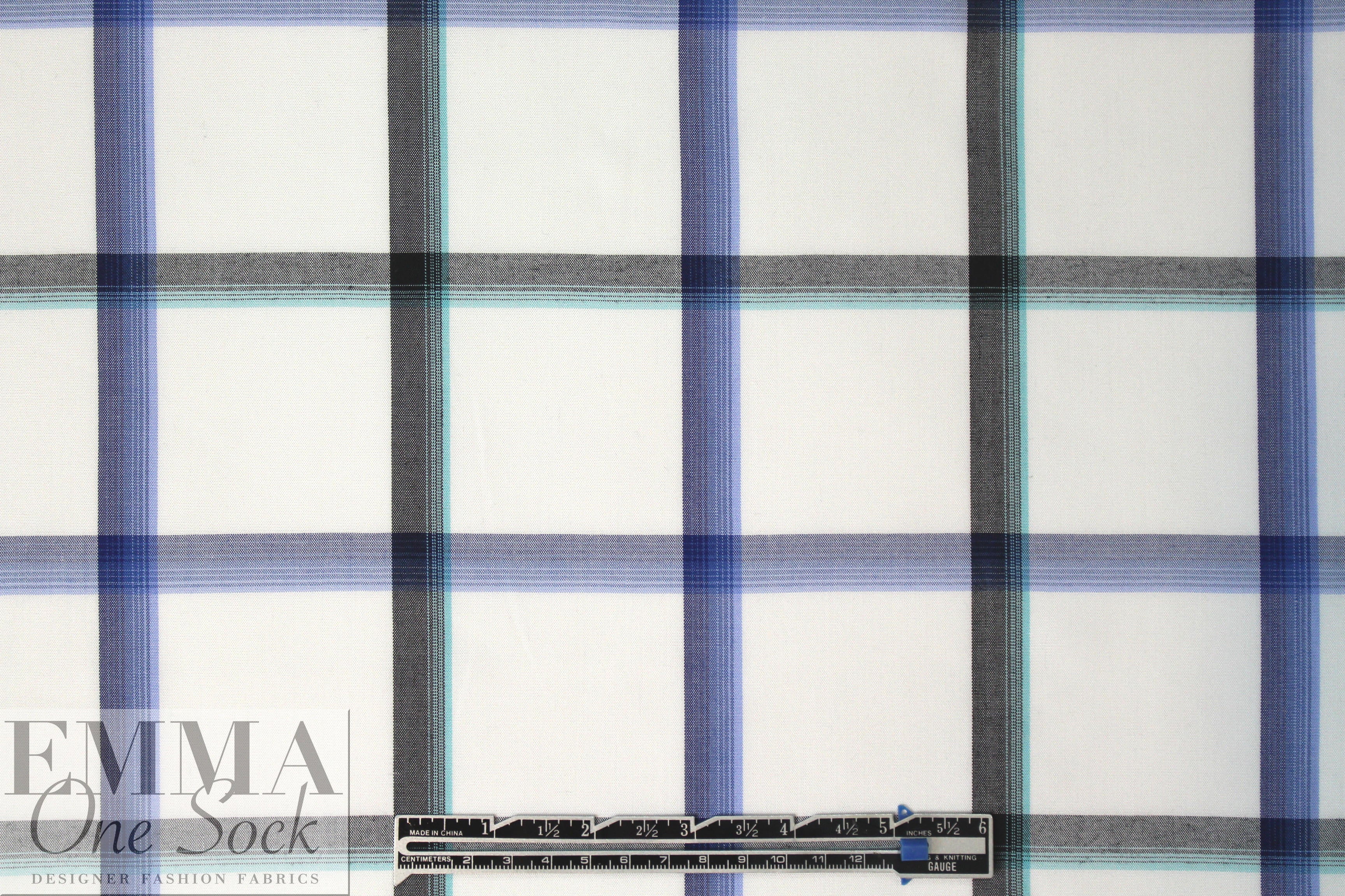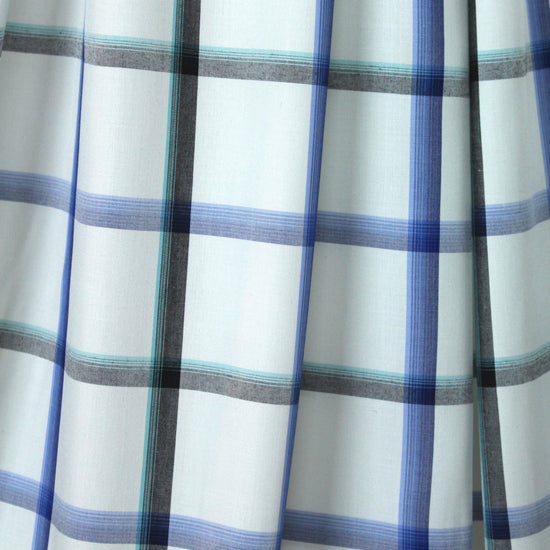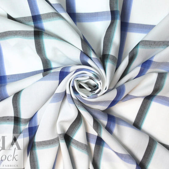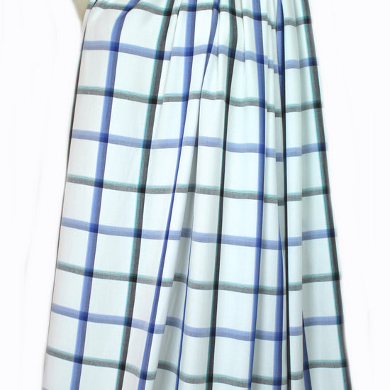 This is a lovely lightweight yarn-dyed viscose woven. It is soft and drapey, with a windowpane plaid design that has a 5.5" repeat. It is nearly opaque, refined and smooth, and the colors include navy, denim, aqua, gray and soft white (PANTONE 16-6030, 17-0625, 14-4816, 12-0311, etc.). Make a lovely blouse, shirt, tunic, top, etc. Dry cleaning or hand or machine wash and hang to dry.