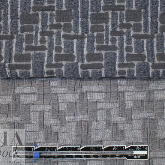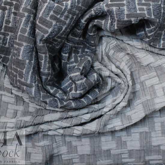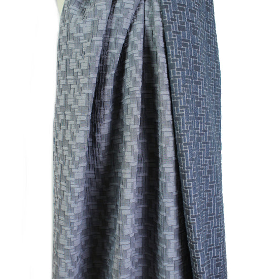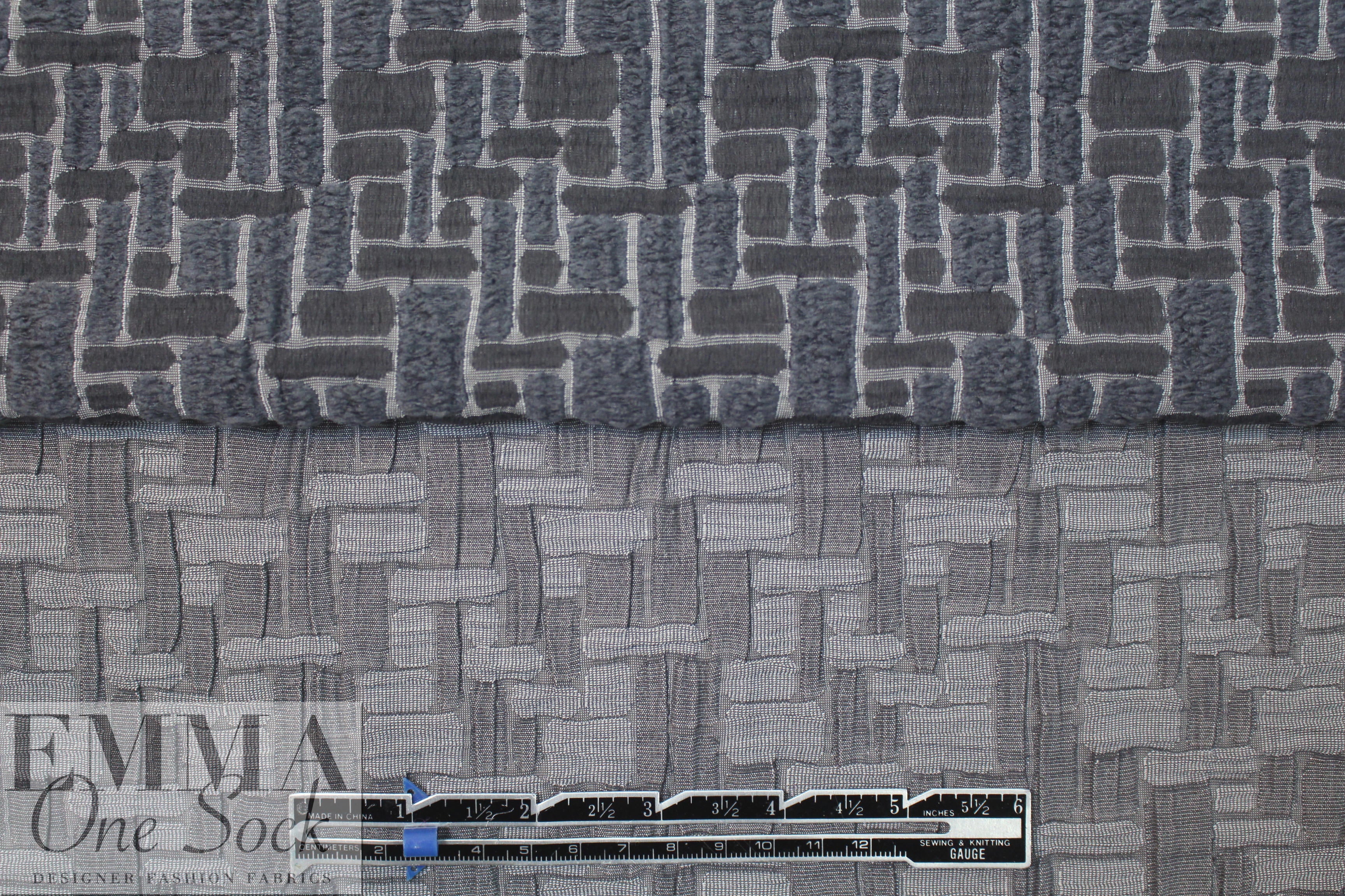 This is a beautiful yarn dyed, textured, jacquard knit from a NY designer. The face has a wonderful basketweave pattern (3" repeat) and the reverse is also very pretty, but better left as the wrong side as there are floaters. The coloring is a neutral pewter tone (PANTONE 18-5203 is close), and the fabric is medium weight with some body in the drape with lots of dimension and texture. It would make a wonderful knit dress or skirt, tunic, fitted jacket, skirt, etc. It has about 10% widthwise stretch and about 20% lengthwise. Test first if you would like to hand wash, and hang to dry, or dry clean.