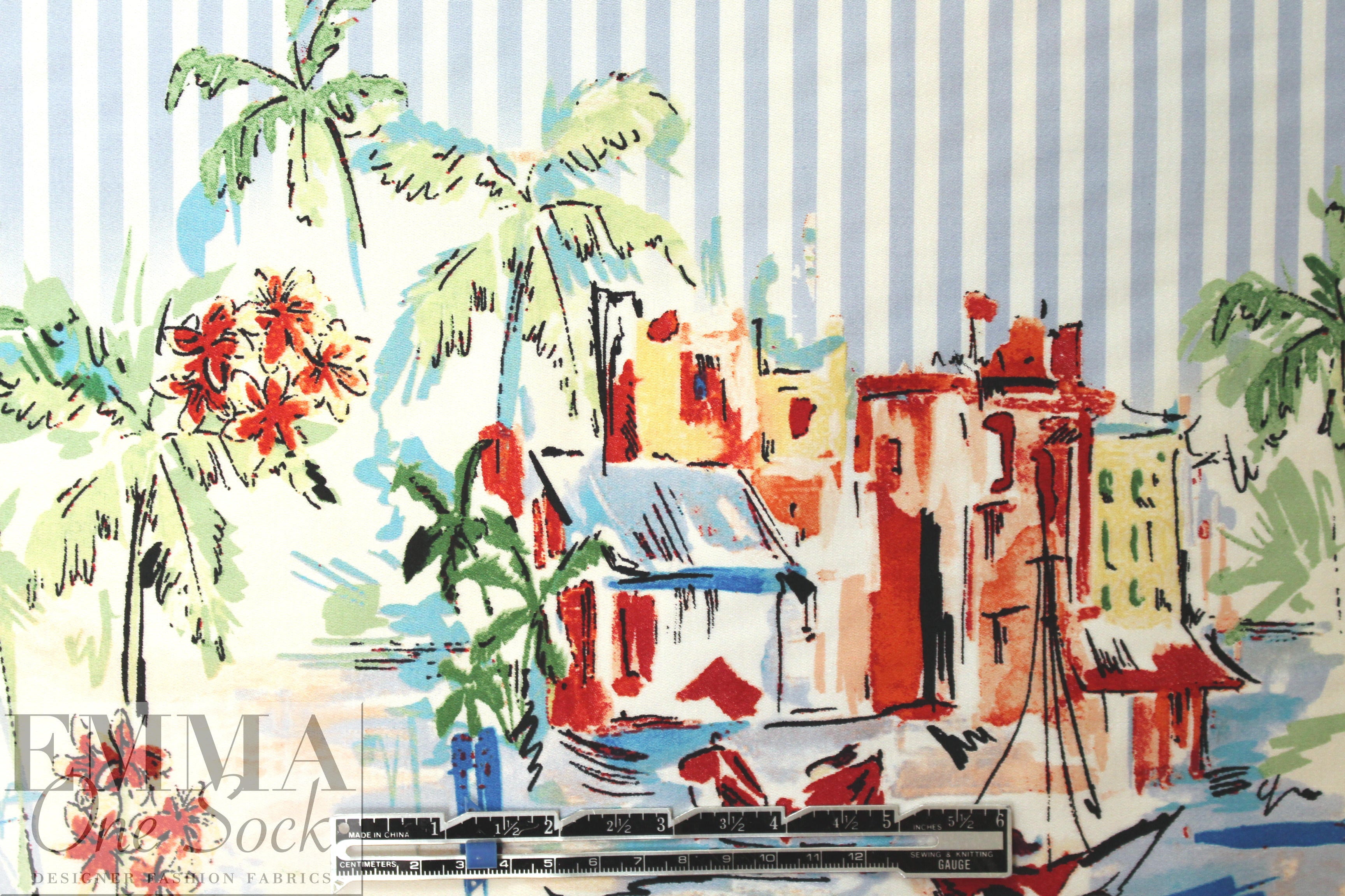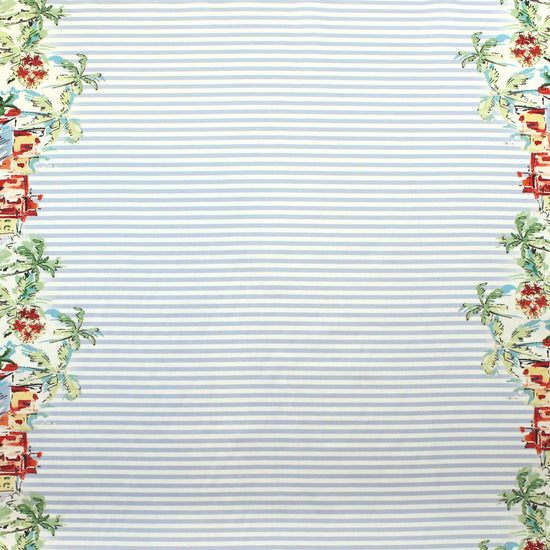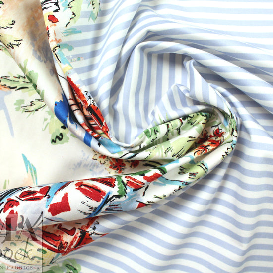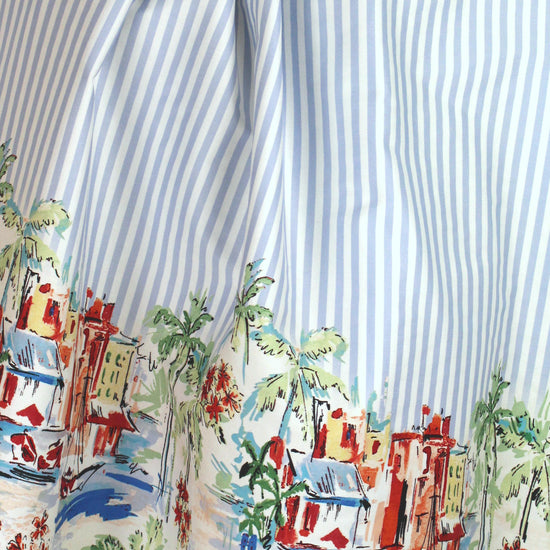 This just in with a shipment from Italian mills! It is a lovely Italian stretch cotton shirting/dress weight (10% widthwise stretch, but very stable so can be cut across the grain), medium-light weight yet opaque, smooth and refined with some cottony crispness in the drape. The wonderful "beachside stripe" border print has a beach scene along each border (about 18" into the center on both sides) with 1/4" stripes in the center. The colors are clear and summery shades of red, white, aqua, green, blue, pink blush, etc. (PANTONE 18-1655, 14-4516, 18-6216, 12-1108, etc.). It is perfect for a pretty dress, shirt, tunic, skirt, etc. Hand or machine wash gentle, and hang to dry (please test first), or dry clean. LAST PIECE, .625 yds.