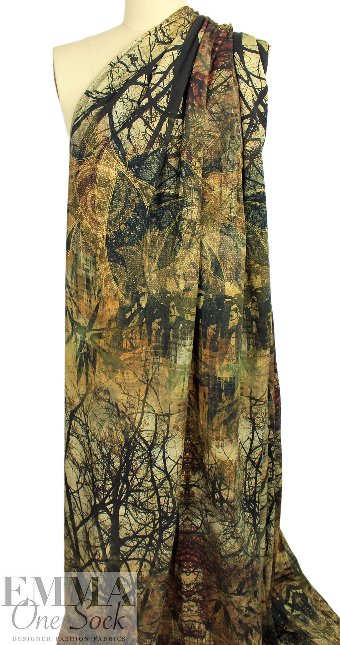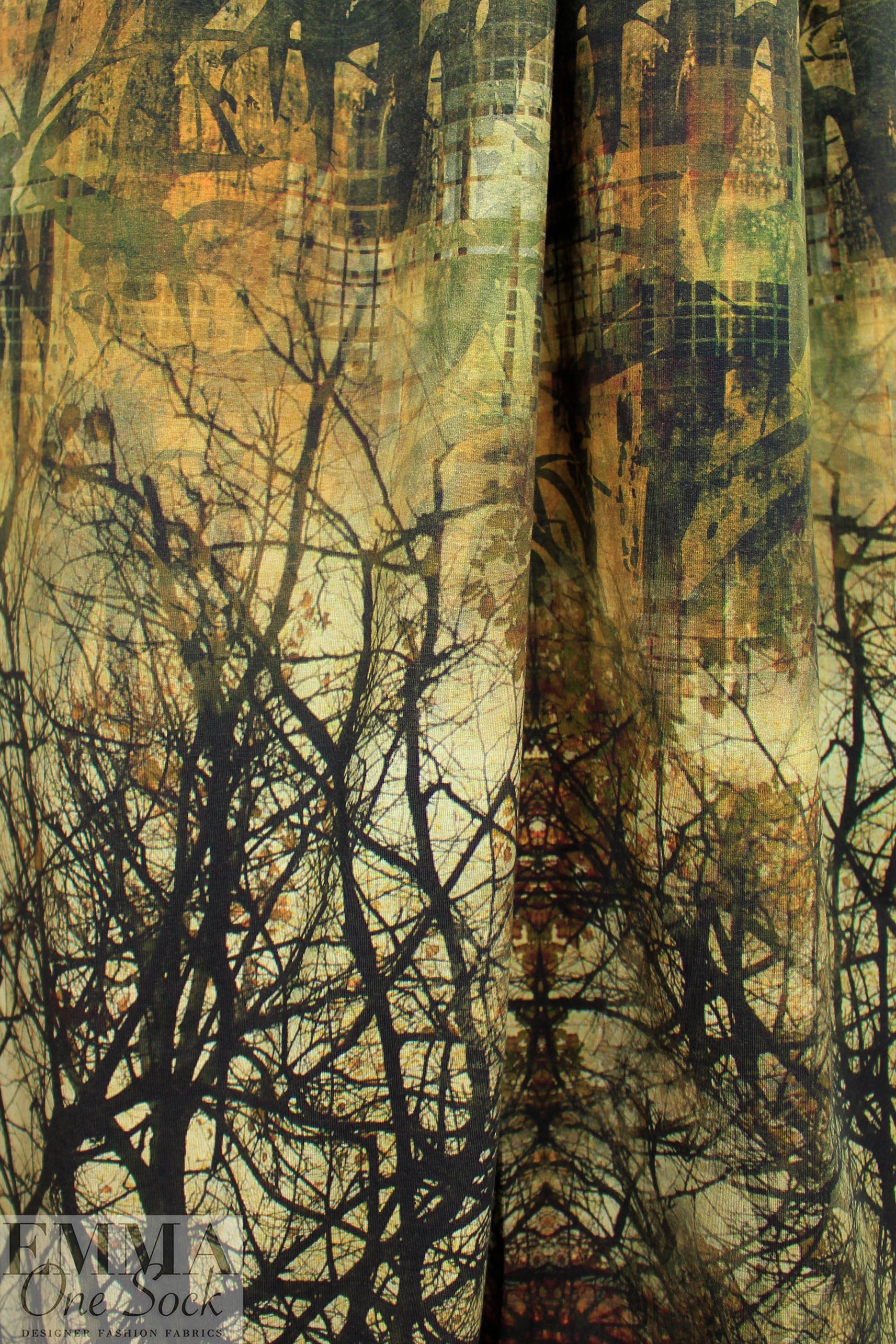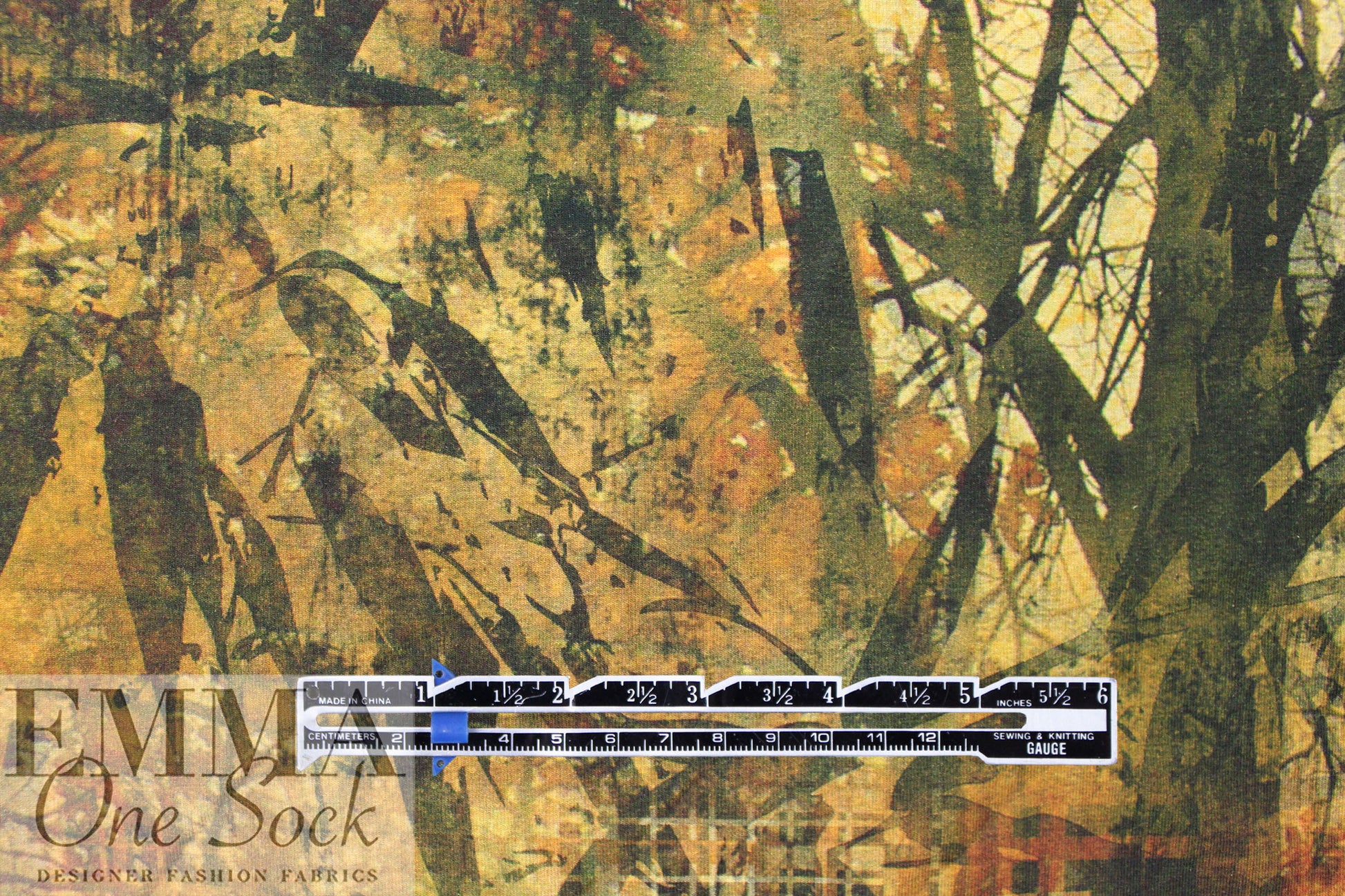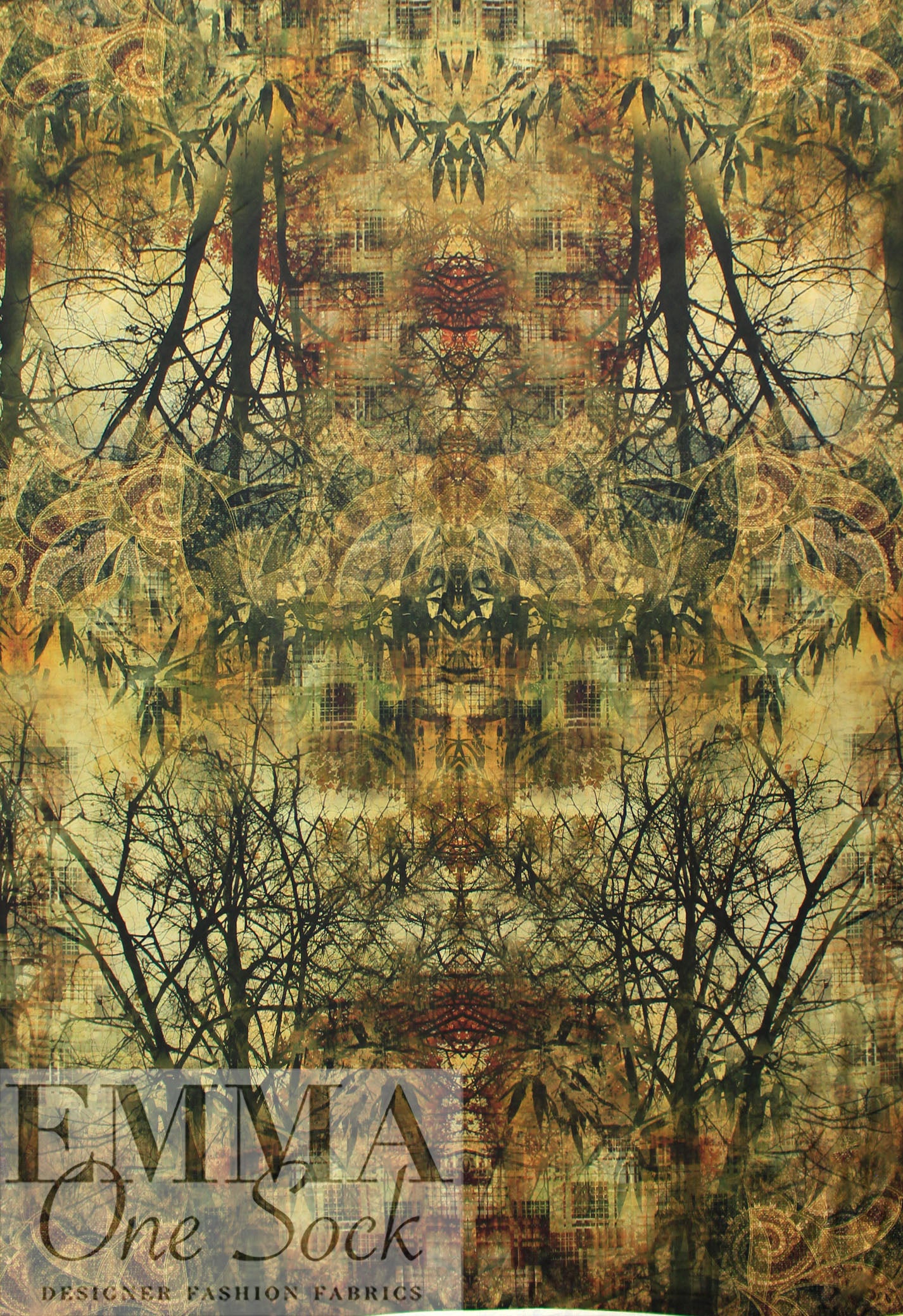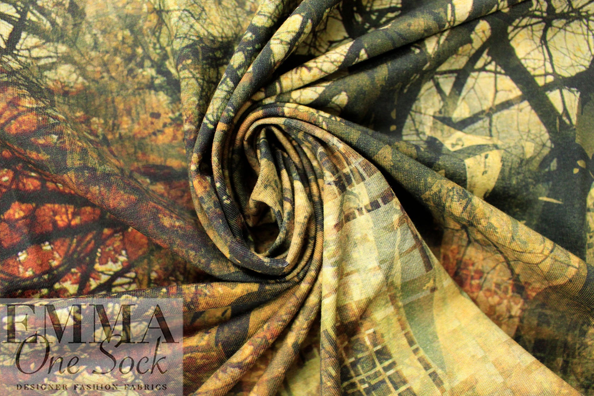 Each panel is 76.5" long, or 2.125 yards, so please order in increments of 2.125 yards for one panel, 4.25 for two, 6.375 for three, and so on. (We can swatch a sample for quality but cannot swatch this print because it is a panel.) Here's another AMAZING cotton/spandex print imported from The Netherlands! First, the quality of the fabric is sublime, soft and substantial, with about 50% stretch in both directions. It is opaque and has a soft hand and drape with body. It is Oeko-Tex certified for non-toxic chemicals and dyes. This intriguing "mirrored treetops" print (76.5" repeat) features shades of hazy yellow-green, coriander, chestnut, thyme, black, etc. (PANTONE 14-0615, 16-1126, 19-1118, 18-0629, etc.). Make a great tee, top, tunic, leggings, skirt, dress, cardigan, hoodie, etc. The manufacturer recommends hand or machine wash warm, hang to dry. Please test first.