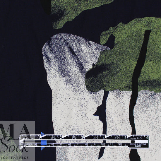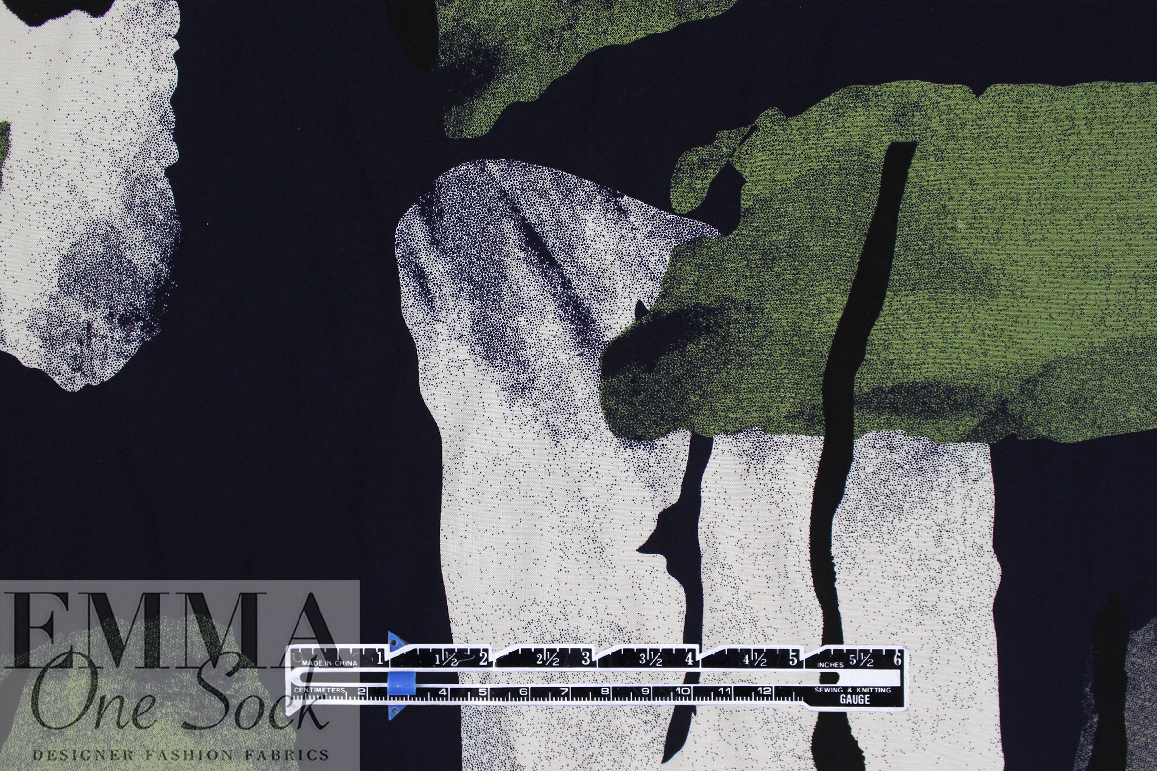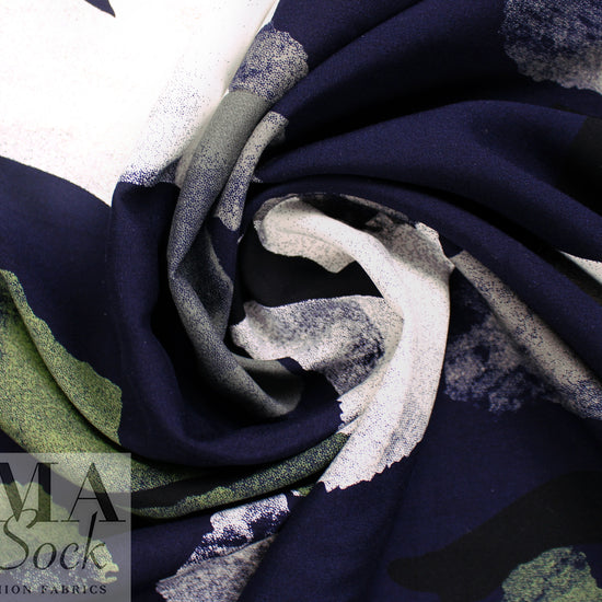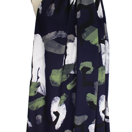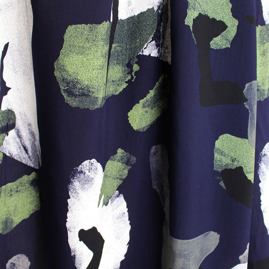 This is a beautiful viscose (rayon) woven, lightweight, drapey and soft, with an abstract shapes print (24.5" repeat) in shades of deep midnight, white, duffel, and leaf green (PANTONE 16-0220, 18-0503, 19-4019, etc.). It is perfect for a shirt or blouse, top, tunic, dress or skirt, etc. It is nearly opaque, but some styles may need lining. Dry clean or hand or machine wash gentle, and hang to dry or dry clean. 1.375 yds.