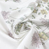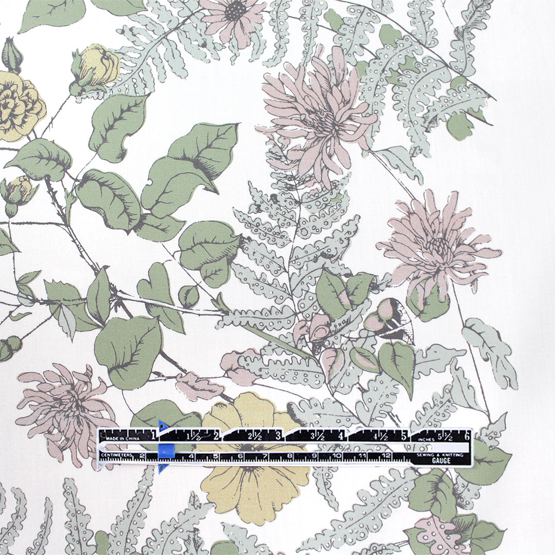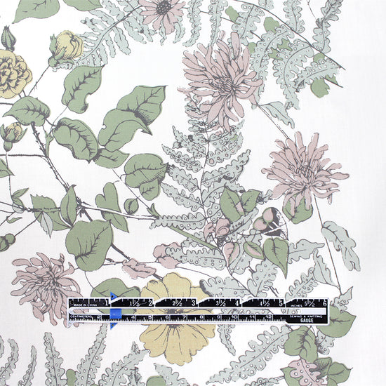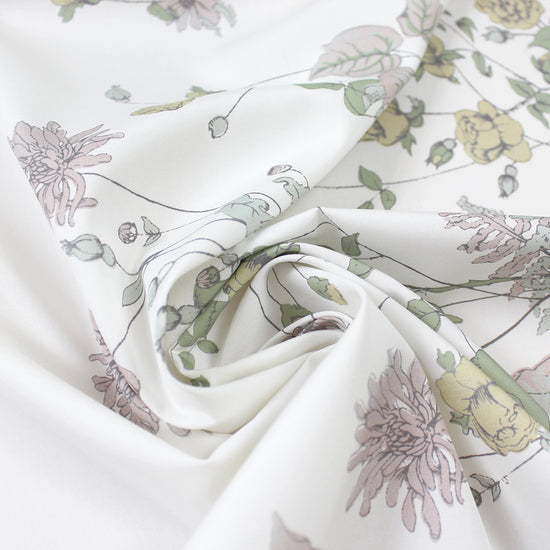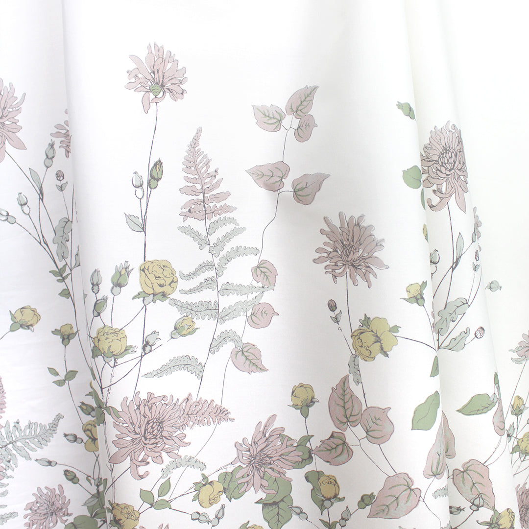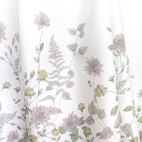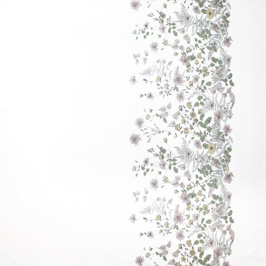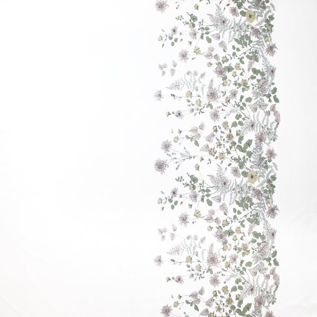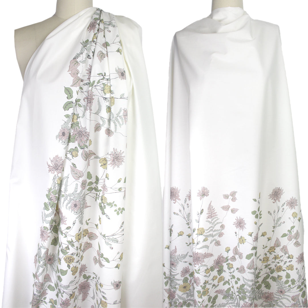 This is a gorgeous quality cotton poplin woven, lightweight and nearly opaque with a cottony drape. The lovely "wildflower row" print (21.5" repeat) features a pattern of illustrated flowers in light blue sage, basil, marzipan, mauve, etc. on a creamy white background (PANTONE 14-1113, 14-1905, 17-6206 but lighter, 14-6308 ish, etc.). The floral design runs vertically near the right selvage, with a large creamy white border to the left of the flowers measuring 28" inches, and another creamy white border to the right which is 8". This fabric is stable in both directions so you can play with design concepts, laying your pattern in either direction. We have shown both orientations in the dressform photo (to the left shown as it comes off the roll, and to the right with the selvages placed at top and bottom). Perfect for a shirt, top, tunic, summer dress, skirt, etc. Hand or machine wash separately, cold, hang to dry (please test first).