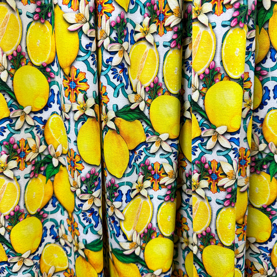 This is a VISCOSE/spandex print imported from The Netherlands! First, the quality of the fabric is excellent, soft and drapey, with about 40% stretch in the width and length. It is lightweight yet opaque and has a soft hand and a matte finish. It is Oeko-Tex certified for non-toxic chemicals and dyes. The "lemons from Mallorca" print has a 6" vertical repeat and features shades of lemon yellow, sunset orange, cobalt blue, leaf green, teal, fuchsia rose, vanilla bean, etc. on a whisper gray background (PANTONE 12-0643, 17-5330, 18-4244, 17-2624, 12-0720, 11-4202, etc.). Make a great tee, top, tunic, leggings, skirt, dress, lightweight cardigan, etc. The manufacturer recommends hand or machine wash warm, hang to dry. Please test first.