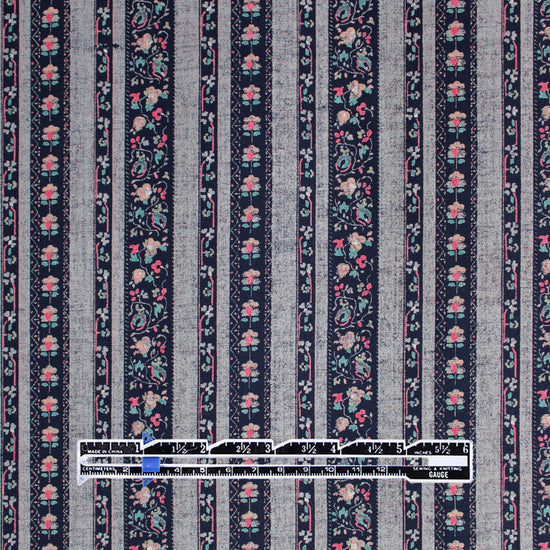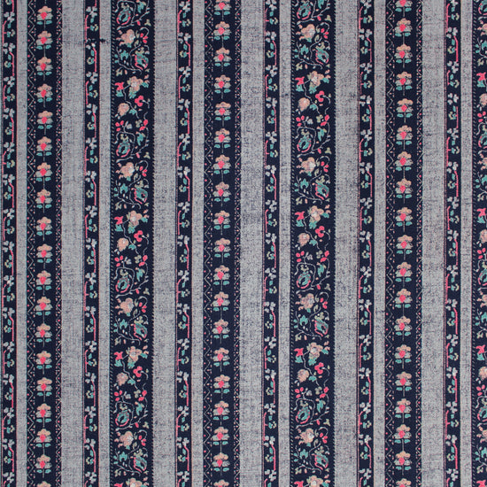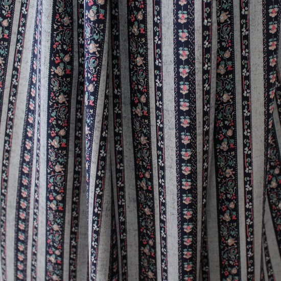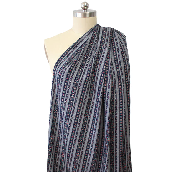 From designer deadstock and produced in Italy for a famous fashion brand, this is a wonderful viscose challis woven with a matte finish and an incredibly soft hand. This modern traditional beauty is light weight and opaque with a flowing, soft drape. The "Nordic cottage" design (3.5" vertical repeat) features sweet floral stripes in French navy and mottled chambray blue with warm pink and teal accents. It is perfect for a shirt, blouse, tunic, top, dress or skirt, etc. It could also be used as a lining fabric. Hand wash, hang to dry (please test first), or dry clean.