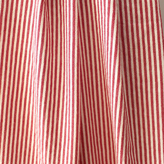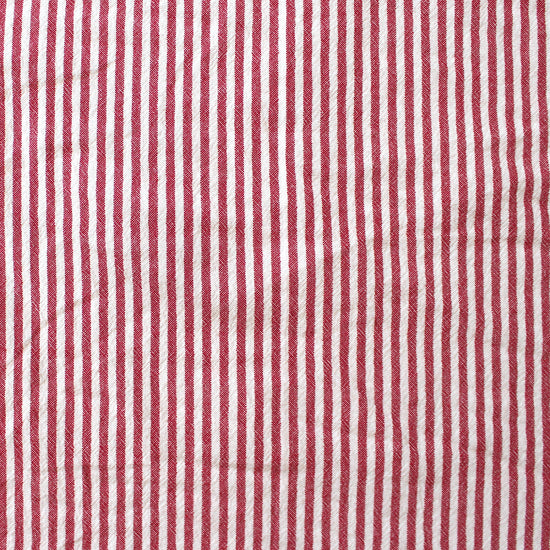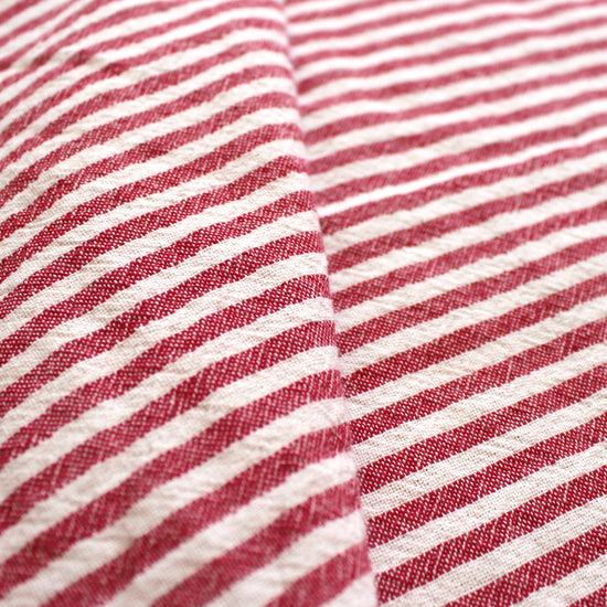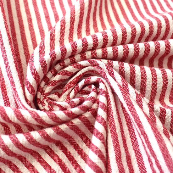 This is an excellent quality yarn-dyed vertical stripe cotton woven (.37" horizontal repeat) in a cherry red and white Breton style stripe. It is beachy and slightly textured, woven from organic cotton. Make a casual tunic or shirt, beach style dress or skirt, palazzo pants, lightweight jacket, etc. It is stable in both directions, so you may orient your stripes either way. If you wish to hand or machine wash, please test first. Hang to dry.