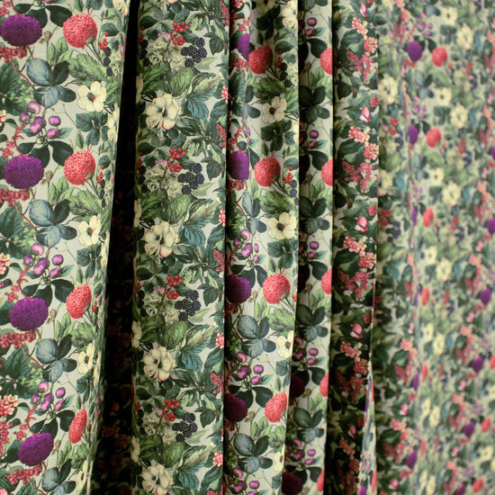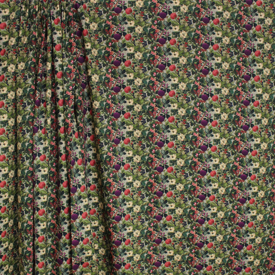 From the Netherlands, this is a 100% cotton poplin with a fun cottage print. Lightweight and completely opaque with a plain weave, it's a wardrobe staple with cottony crispness in the drape and no stretch. The "jamberry" pattern (4.75" repeat) features a bramble of berries and foliage in pink and purple berry tones with an array of greens on a sagey background. Perfect for classic shirts, dresses, skirts, even home decor and accessories. Hand or machine wash gentle, in cold water and hang to dry (please test first).